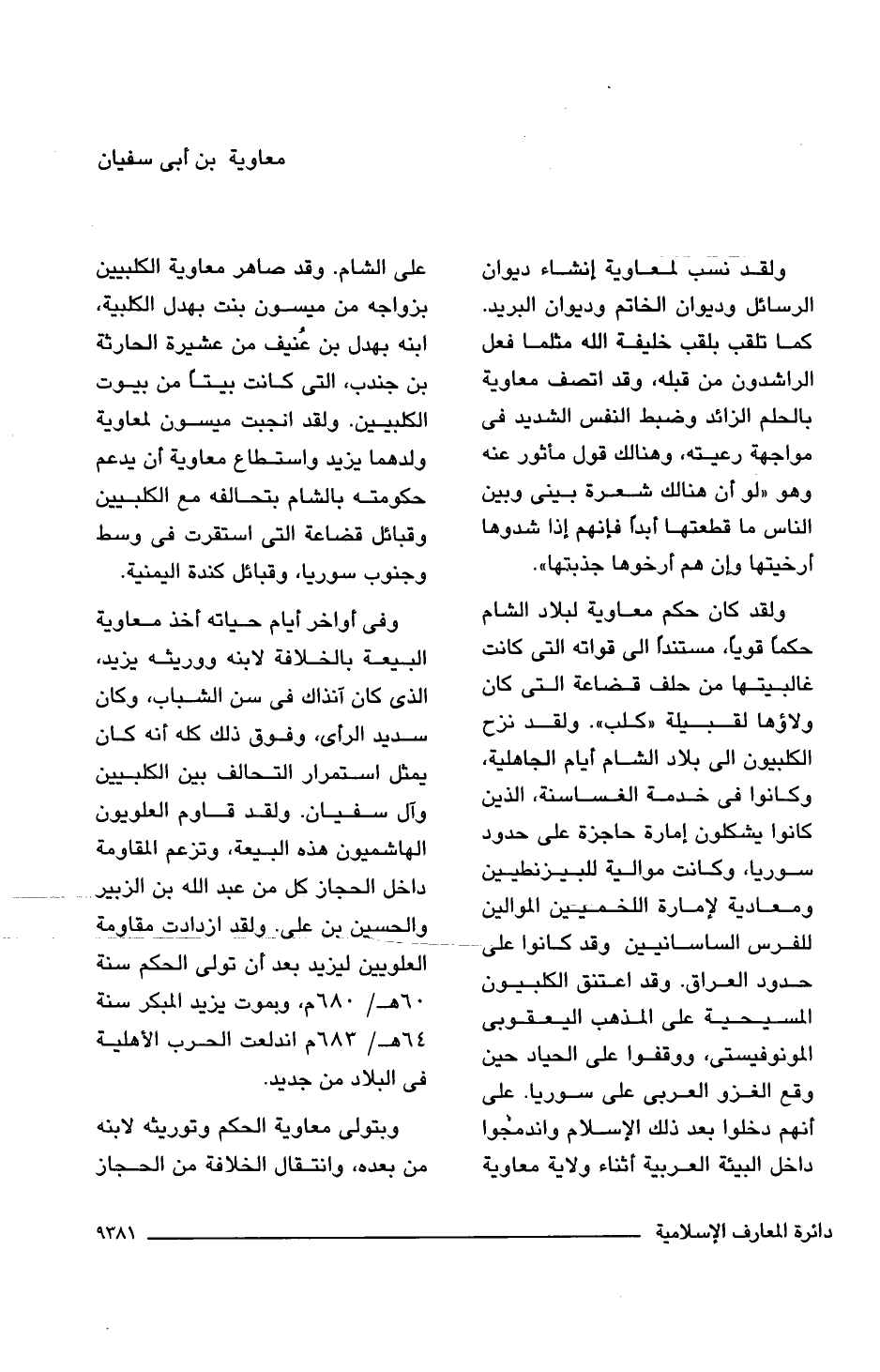 وفى أواخر أيام حياته أخذ معاوية البيعة بالخلافة لابنه ووريثه يزيد، الذى كان آنذاك فى سن الشباب، وكان سديد الرأى، وفوق ذلك كله أنه كان يمثل استمرار التحالف بين الكلبيين وآل سفيان. ولقد قاوم العلويون الهاشميون هذه البيعة، وتزعم المقاومة داخل الحجاز كل من عبد اللَّه بن الزبير والحسين بن على. ولقد ازدادت مقاومة العلويين ليزيد بعد أن تولى الحكم سنة 60 هـ/ 680 م، وبموت يزيد المبكر سنة 64 هـ/ 683 م اندلعت الحرب الأهلية فى البلاد من جديد.