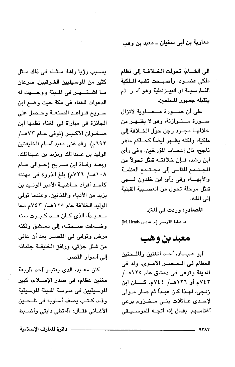 أبو عباد، أحد المغنين والملحنين العظام فى العصر الأموى. ولد فى المدينة وتوفى فى دمشق عام 125 هـ/ 743 م أو 126 هـ/ 744 م. كان ابن زنجى، لهذا كان عبدًا ثم صار مولى لإحدى عائلات بنى مخزوم يرعى أغنامهم. يقال إنه اتجه للموسيقى بسبب رؤيا رآها، مثله فى ذلك مثل كثير من الموسيقيين الشرقيين. سرعان ما اشتهر فى المدينة ووجهت له الدعوات للغناء فى مكة حيث وضع ابن سريح قواعد الصنعة وحصل على الجائزة فى مباراة فى الغناء نظمها ابن صفوان الأكبر (توفى عام 73 هـ/ 692 م). وقد غنى معبد أمام الخليفتين الوليد بن عبد الملك ويزيد بن عبد الملك. وبعد وفاة ابن سريح (حوالى عام 108 هـ/ 726 م) بلغ الذروة فى مهنته كأحد أفراد حاشية الأمير الوليد بن يزيد من الأدباء والفنانين. وعندما تولى الوليد الخلافة عام 125 هـ/ 743 م دعا معبدًا، الذى كان قد كبرت سنه وضعفت صحته، إلى دمشق ولكنه مرض وتوفى فى القصر بعد أن عانى من شلل جزئى، ورافق الخليفة جثمانه إلى أسوار القصر.
