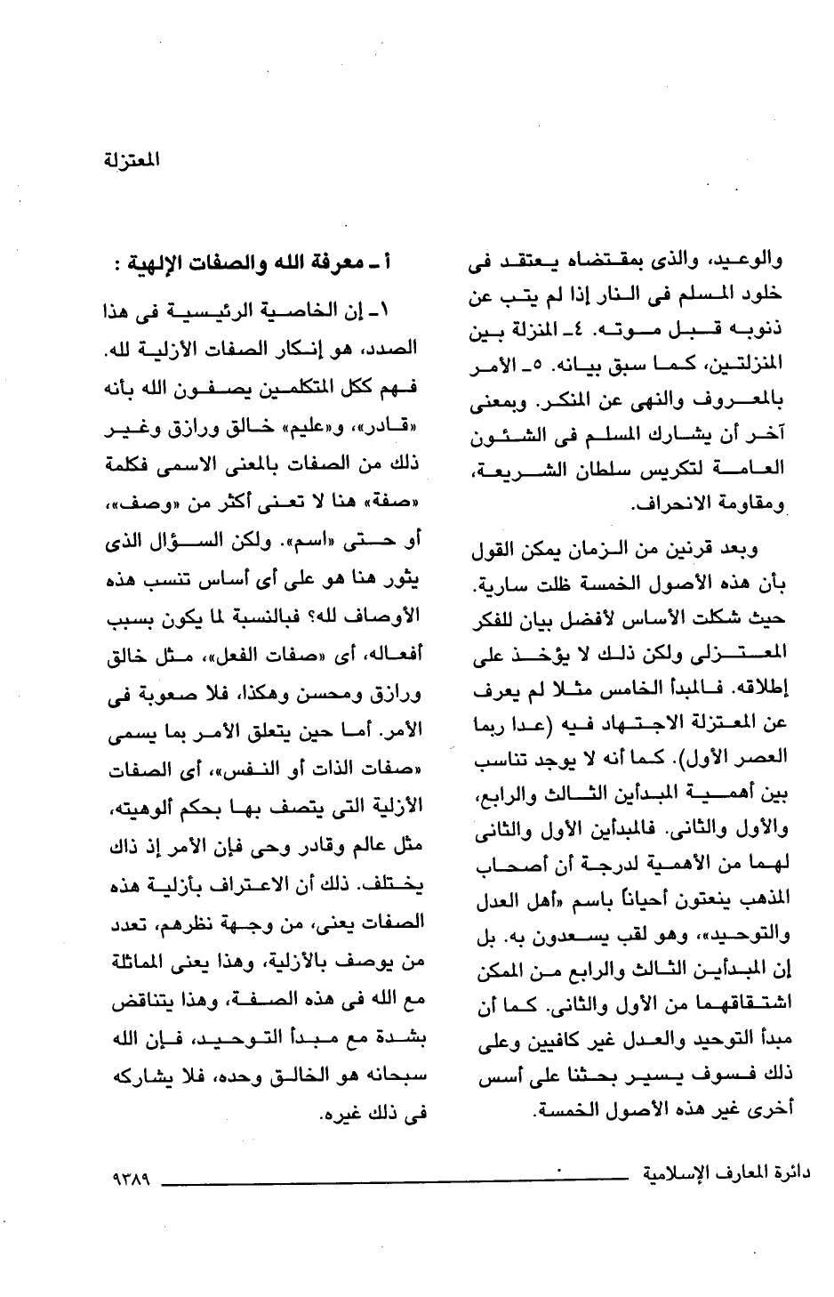 والوعيد، والذى بمقتضاه يعتقد فى خلود المسلم فى النار إذا لم يتب عن ذنوبه قبل موته. 4 - المنزلة بين المنزلتين، كما سبق بيانه. 5 - الأمر بالمعروف والنهى عن المنكر. وبمعنى آخر أن يشارك المسلم فى الشئون العامة لتكريس سلطان الشريعة، ومقاومة الانحراف.