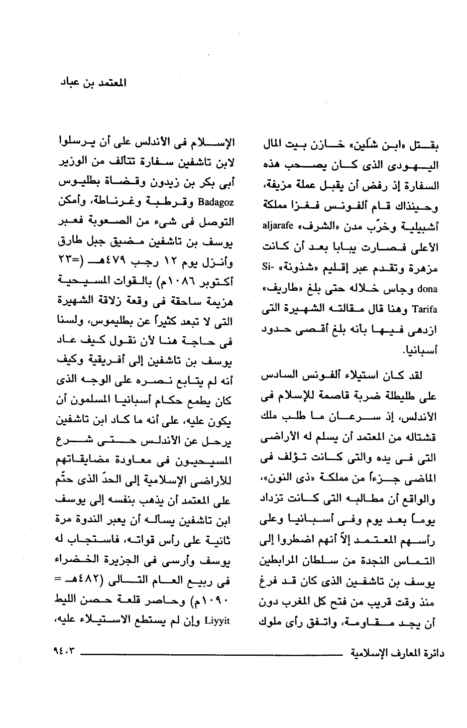 لقد كان استيلاء ألفونس السادس على طليطلة ضربة قاصمة للإسلام فى الأندلس، إذ سرعان ما طلب ملك قشتاله من المعتمد أن يسلم له الأراضى التى فى يده والتى كانت تؤلف فى الماضى جزءًا من مملكة "ذى النون"، والواقع أن مطالبه التى كانت تزداد يومًا بعد يوم وفى أسبانيا وعلى رأسهم المعتمد إلّا أنهم اضطروا إلى التماس النجدة من سلطان المرابطين يوسف بن تاشفين الذى كان قد فرغ منذ وقت قريب من فتح كل المغرب دون أن يجد مقاومة، واتفق رأى ملوك الإسلام فى الأندلس على أن يرسلوا لابن تاشفين سفارة تتألف من الوزير أبى بكر بن زيدون وقضاة بطليوس Badagoz وقرطبة وغرناطة، وأمكن التوصل فى شئ من الصعوبة فعبر يوسف بن تاشفين مضيق جبل طارق وأنزل يوم 12 رجب 479 هـ) (= 23 أكتوبر 1086 م) بالقوات المسيحية هزيمة ساحقة فى وقعة زلاقة الشهيرة التى لا تبعد كثيرًا، عن بطليموس، ولسنا فى حاجة هنا لأن نقول كيف عاد يوسف بن تاشفين إلى أفريقية وكيف أنه لم يتابع نصره على الوجه الذى كان يطمع حكام أسبانيا المسلمون أن يكون عليه، على أنه ما كاد ابن تاشفين يرحل عن الأندلس حتى شرع المسيحيون فى معاودة مضايقاتهم للأراضى الإسلامية إلى الحدّ الذى حتم على المعتمد أن يذهب بنفسه إلى يوسف ابن تاشفين يسأله أن يعبر الندوة مرة ثانية على رأس قواته، فاستجاب له يوسف وأرسى فى الجزيرة الخضراء فى ربيع العام التالى (482 هـ = 1090 م) وحاصر قلعة حصن الليط Liyyit وإن لم يستطع الاستيلاء عليه،