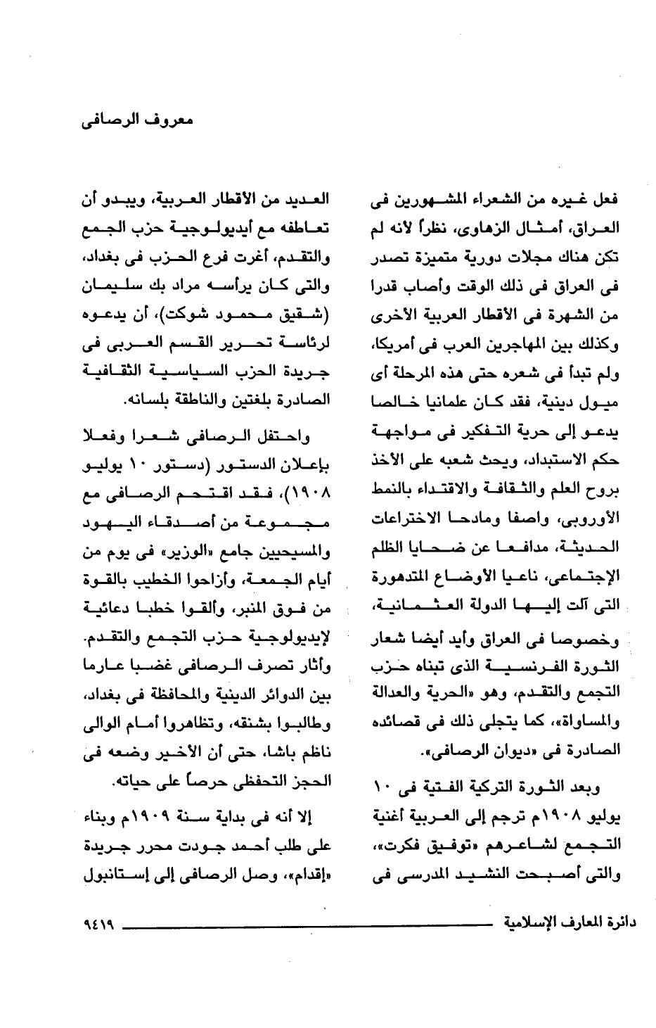 وبعد الثورة التركية الفتية فى 10 يوليو 1908 م ترجم إلى العربية أغنية التجمع لشاعرهم "توفيق فكرت"، والتى أصبحت النشيد المدرسى فى العديد من الأقطار العربية، ويبدو أن تعاطفه مع أيديولوجية حزب الجمع والتقدم، أغرت فرع الحزب فى بغداد، والتى كان يرأسه مراد بك سليمان (شقيق محمود شوكت)، أن يدعوه لرئاسة تحرير القسم العربى فى جريدة الحزب السياسية الثقافية الصادرة بلغتين والناطقة بلسانه.