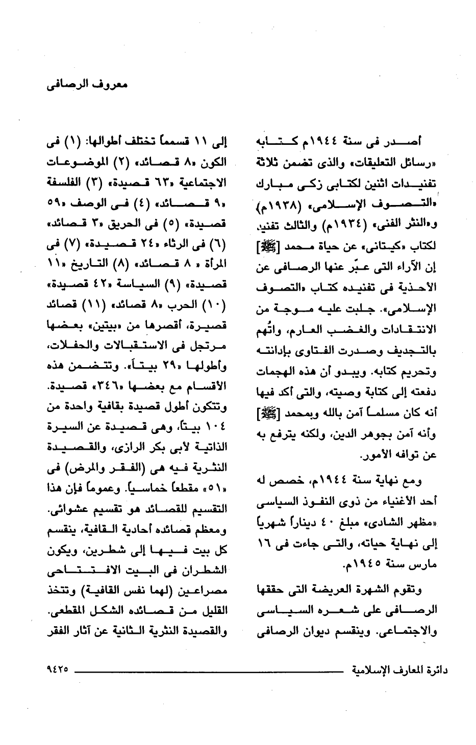 أصدر فى سنة 1944 م كتابه "رسائل التعليقات" والذى تضمن ثلاثة تفنيدات اثنين لكتابى زكى مبارك "التصوف الإسلامى" (1938 م) و"النثر الفنى" (1934 م) والثالث تفنيد، لكتاب "كيتانى" عن حياة محمد [-صلى اللَّه عليه وسلم-] إن الآراء التى عبّر عنها الرصافى عن الأحذية فى تفنيده كتاب "التصوف الإسلامى". جلبت عليه موجة من الانتقادات والغضب العارم، واتهم بالتجديف وصدرت الفتاوى بإدانته وتحريم كتابه. ويبدو أن هذه الهجمات دفعته إلى كتابة وصيته، والتى أكد فيها أنه كان مسلمًا آمن باللَّه وبمحمد [-صلى اللَّه عليه وسلم-] وأنه آمن بجوهر الدين، ولكنه يترفع به عن توافه الأمور.