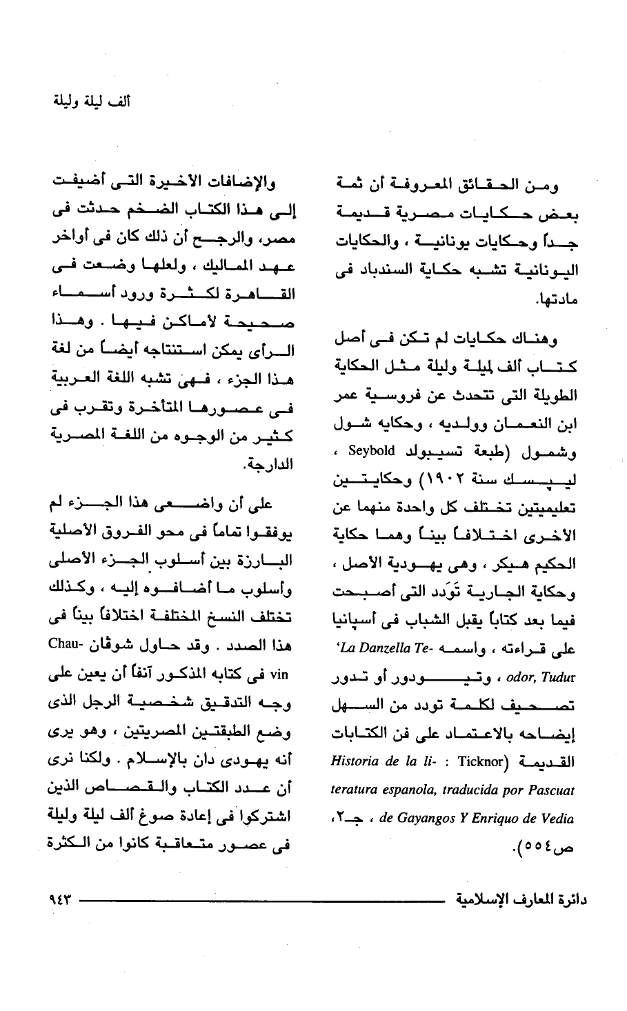 على أن واضعى هذا الجزء لم يوفقوا تماماً فى محو الفروق الأصلية البارزة بين أسلوب الجزء الأصلى وأسلوب ما أضافوه إليه، وكذلك تختلف النسخ المختلفة اختلافا بينا فى هذا الصدد. وقد حاول شوفان - Chau vin فى كتابه المذكور آنفاً أن يعين على وجه التدقيق شخصية الرجل الذى وضع الطبقتين المصريتين، وهو يرى أنه يهودى دان بالإسلام. ولكنا نرى أن عدد الكتاب والقصاص الذين اشتركوا فى إعادة صوغ ألف ليلة وليلة فى عصور متعاقبة كانوا من الكثرة
