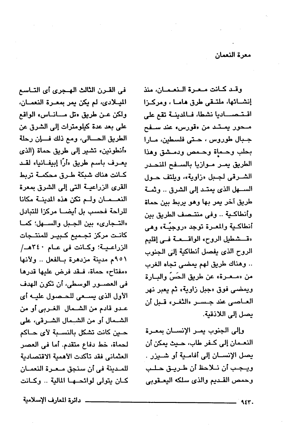 وإلى الجنوب يمر الإنسان بمعرة النعمان إلى كفر طاب، حيث يمكن أن يصل الإنسان إلى أفامية أو شيزر. ويجب أن نلاحظ أن طريق حلب وحمص القديم والذى سلكه اليعقوبى فى القرن الثالث الهجرى أى التاسع الميلادى، لم يكن يمر بمعرة النعمان، ولكن عن طريق "تل ماناس" الواقع على بعد عدة كيلومترات إلى الشرق عن الطريق الحالى، ومع ذلك فإن رحلة "أنطونين" تشير إلى طريق حماة (الذى يعرف باسم طريق "أرا إبيفانيا" لقد كانت هناك شبكة طرق محكمة تربط القرى الزراعية التى إلى الشرق بمعرة النعمان ولم تكن هذه المدينة مكانا للراحة فحسب بل أيضا مركزا للتبادل "التجارى" بين الجبل والسهل؛ كما كانت مركز تجميع كبير للمنتجات الزراعية؛ وكانت فى عام 340 هـ/ 951 م مدينة مزدهرة بالفعل. . ولأنها "مفتاح" حماة، فقد فرض عليها قدرها فى العصور الوسطى، أن تكون الهدف الأول الذى يسعى للحصول عليه أى عدو قادم من الشمال الغربى أو من الشمال أو من الشمال الشرقى، على حين كانت تشكل بالنسبة لأى حاكم لحماة، خط دفاع متقدم. أما فى العصر العثمانى فقد تأكدت الأهمية الاقتصادية للمدينة فى أن سنجق معرة النعمان كان يتولى لوائحها المالية. . وكانت