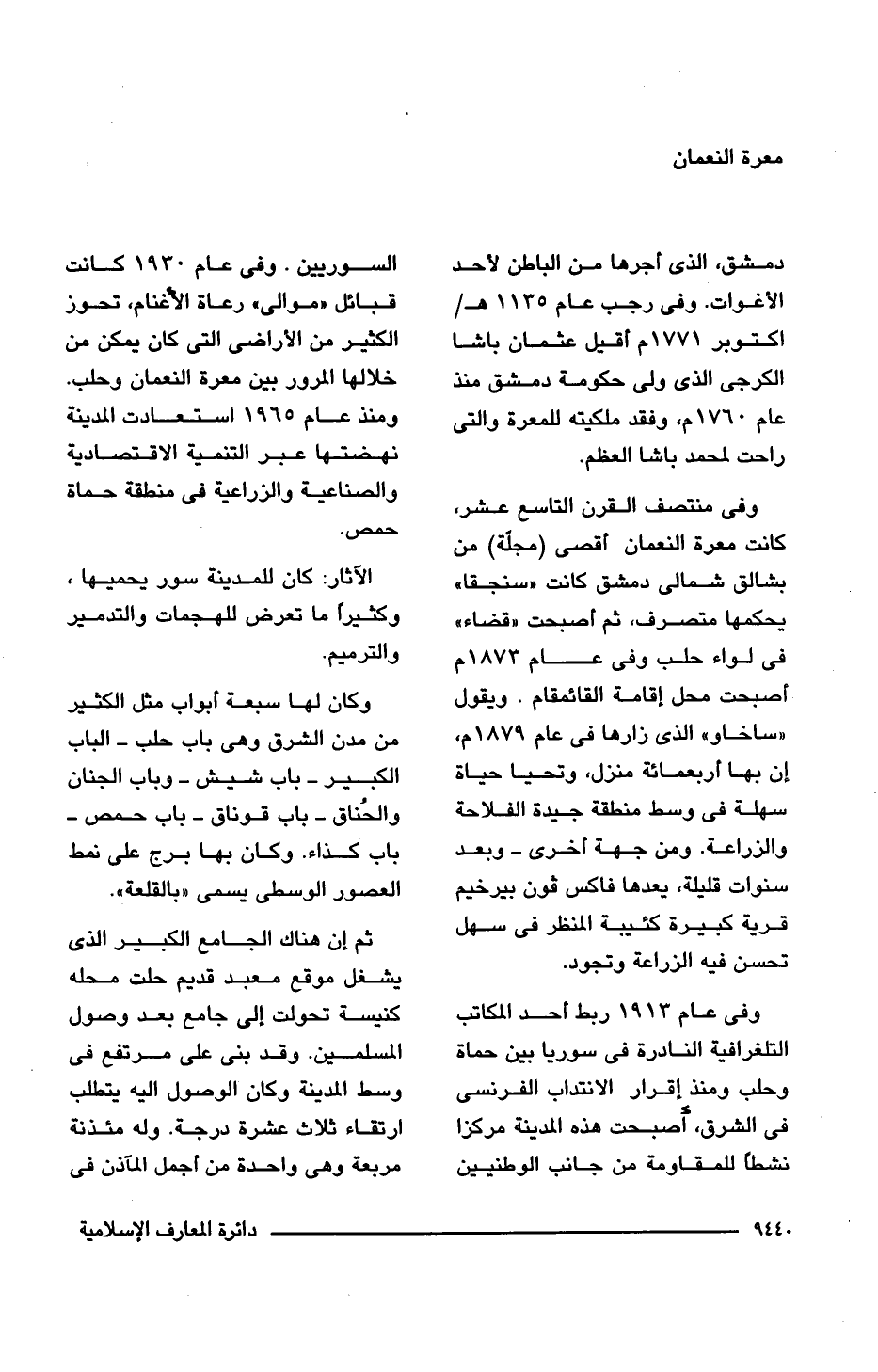 دمشق، الذى أجرها من الباطن لأحد الأغوات. وفى رجب عام 1135 هـ/ اكتوبر 1771 م أقيل عثمان باشا الكرجى الذى ولى حكومة دمشق منذ عام 1760 م، وفقد ملكيته للمعرة والتى راحت لمحمد باشا العظم.