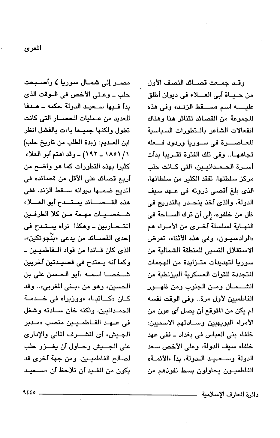 وقد جمعت قصائد النصف الأول من حياة أبى العلاء فى ديوان أطلق عليه اسم "سقط الزند" وفى هذه المجموعة من القصائد تتناثر هنا وهناك انفعالات الشاعر بالتطورات السياسية المعاصرة فى سوريا وردود فعله تجاهها. . وفى تلك الفترة تقريبًا بدأت أسرة الحمدانيين، التى كانت حلب مركز سلطتها، تفقد الكثير من سلطانها، الذى بلغ أقصى ذروته فى عهد سيف الدولة، والذى أخذ ينحدر بالتدريج فى ظل من خلفوه، إلى أن ترك الساحة فى النهاية لسلسلة أخرى من الأمراء هم "الرادسيون" وفى هذه الأثناء، تعرض الاستقلال النسبى للمنطقة الشمالية من سوريا لتهديدات متزايدة من الهجمات المتجددة للقوات العسكرية البيزنطية من الشمال ومن الجنوب ومن ظهور الفاطميين لأول مرة. . وفى الوقت نفسه لم يكن من المتوقع أن يصل أى عون من الأمراء البويهيين وسادتهم الاسميين: خلفاء بنى العباس فى بغداد -ففى عهد خلفاء سيف الدولة، وعلى الأخص سعد الدولة وسعيد الدولة، بدأ "الأئمة" الفاطميون يحاولون بسط نفوذهم من مصر إلى شمال سوريا، وأصبحت حلب -وعلى الأخص فى الوقت الذى بدأ فيها سعيد الدولة حكمه- هدفًا للعديد من عمليات الحصار التى كانت تطول ولكنها جميعا باءت بالفشل انظر ابن العديم: زبدة الطلب من تاريخ حلب (1/ 1851 - 192) -وقد اهتم أبو العلاء كثيرًا بهذه التطورات كما هو واضح من أربع قصائد على الأقل من قصائده فى المديح ضمها ديوانه سقط الزند. ففى هذه القصائد يمتدح أبو العلاء شخصيات مهمة من كلا الطرفين المتحاربين -وهكذا نراه يمتدح فى إحدى القصائد من يدعى "بَنْجوتكين"، الذى كان قائدًا من قواد الفاطميين- وكما أنه يمتدح فى قصيدتين أخريين شخصا اسمه "أبو الحسن على بن الحسين" وهو من "بنى المغربى". . وقد كان "كاتبًا "ووزيرًا" فى خدمة الحمدانيين، ولكنه خان سادته وشغل فى عهد الفاطميين منصب "مدبر الجيش" أى المشرف المالى والإدارى على الجيش وحاول أن يغزو حلب لصالح الفاطميين. ومن جهة أخرى قد يكون من المفيد أن نلاحظ أن "سعيد