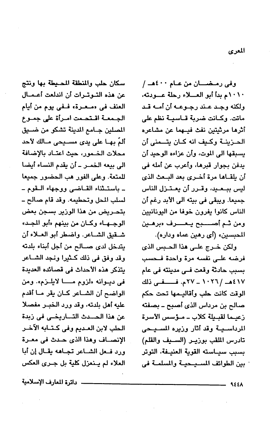 ولكن خرج على هذا الحبس الذى فرضه على نفسه مرة واحدة فحسب بسبب حادثة وقعت فى مدينته فى عام 417 هـ/ 1026 - 1027 م. ففى ذلك الوقت كانت حلب وأقاليمها تحت حكم صالح بن مرداس الذى أصبح -بصفته زعيمًا لقبيلة كلاب- مؤسس الأسرة المرداسية وقد أثار وزيره المسيحى تادرس الملقب بوزير (السيف والقلم) بسبب سياسته القوية العنيفة، التوتر بين الطوائف المسيحية والمسلمة فى سكان حلب والمنطقة المحيطة بها ونتج عن هذه التوترات أن اندلعت أعمال العنف فى "معرة" ففى يوم من أيام الجمعة اقتحمت امرأة على جموع المصلين جامع المدينة تشكو من ضيق ألمَّ بها على يدى مسيحى مالك لأحد محلات الخمور، حيث اعتاد بالإضافة إلى بيعه الخمر -أن يقدم النساء أيضًا للمتعة. وعلى الفور هب الحضور جميعًا -باستثناء القاضى ووجهاء القوم- لسلب المحل وتحطيمه. وقد قام صالح -بتحريض من هذا الوزير بسجن بعض الوجهاء وكان من بينهم "أبو المجد" شقيق الشاعر. واضطر أبو العلاء أن يتدخل لدى صالح من أجل أبناء بلدته وقد وفق فى ذلك كثيرًا ونجد الشاعر يتذكر هذه الأحداث فى قصائده العديدة فى ديوانه "لزوم ما لا يلزم". ومن الواضح أن الشاعر كان يقر ما أقدم عليه أهل بلدته، وقد ورد الخبر مفصلا عن هذا الحديث التاريخى فى زبدة الحلب لابن العديم وفى كتابه الآخر الإنصاف وهذا الذى حدث فى معرة ورد فعل الشاعر تجاهه يقال إن أبا العلاء لم ينعزل كلية بل جرى العكس
