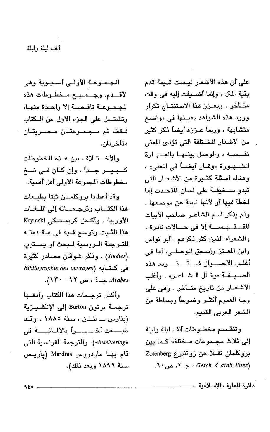 وتنقسم مخطوطات ألف ليلة وليلة إلى ثلاث مجموعات مختلفة كما بين بروكلمان نقلا عن زوتنبرغ Zotenberg (Gesch. d. arab. litter، جـ 2، ص 60.