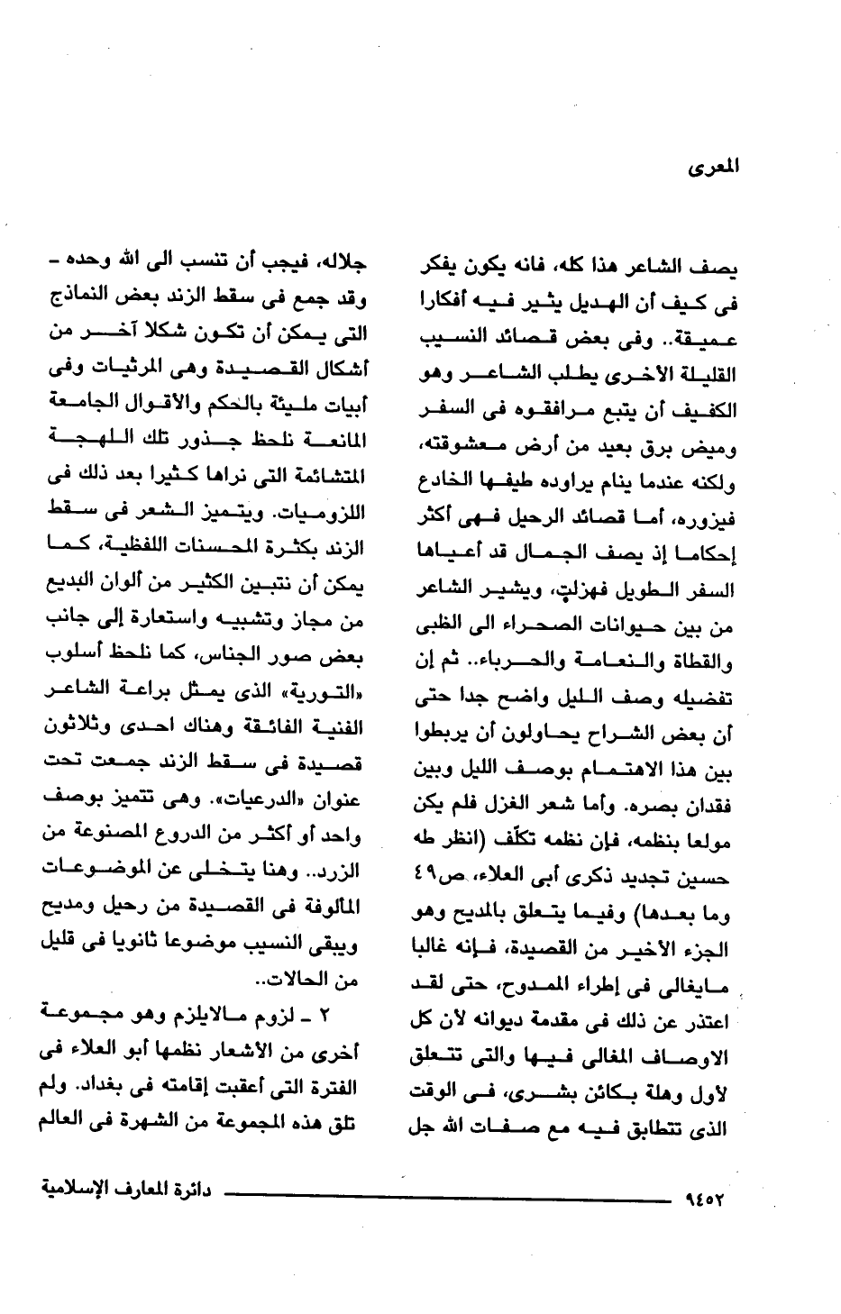 يصف الشاعر هذا كله، فانه يكون يفكر فى كيف أن الهديل يثير فيه أفكارًا عميقة. . وفى بعض قصائد النسيب القليلة الأخرى يطلب الشاعر وهو الكفيف أن يتبع مرافقوه فى السفر وميض برق بعيد من أرض معشوقته، ولكنه عندما ينام يراود. طيفها الخادع فيزوره، أما قصائد الرحيل فهى أكثر إحكامًا إذ يصف الجمال قد أعياها السفر الطويل فهزلت، ويشير الشاعر من بين حيوانات الصحراء إلى الظبى والقطاة والنعامة والحرباء. . ثم إن تفضيله وصف الليل واضح جدًا حتى أن بعض الشراح يحاولون أن يربطوا بين هذا الاهتمام بوصف الليل وبين فقدان بصره. وأما شعر الغزل فلم يكن مولعًا بنظمه، فإن نظمه تكلّف (انظر طه حسين تجديد ذكرى أبى العلاء، ص 49 وما بعدها) وفيما يتعلق بالمديح وهو الجزء الأخير من القصيدة، فإنه غالبًا ما يغالى فى إطراء الممدوح، حتى لقد اعتذر عن ذلك فى مقدمة ديوانه لأن كل الأوصاف المغالى فيها والتى تتعلق لأول وهلة بكائن بشرى، فى الوقت الذى تتطابق فيه مع صفات اللَّه جل جلاله، فيجب أن تنسب إلى اللَّه وحده -وقد جمع فى سقط الزند بعض النماذج التى يمكن أن تكون شكلا آخر من أشكال القصيدة وهى المرثيات وفى أبيات مليئة بالحكم والأقوال الجامعة المانعة نلحظ جذور تلك اللهجة المتشائمة التى نراها كثيرًا بعد ذلك فى اللزوميات. ويتميز الشعر فى سقط الزند بكثرة المحسنات اللفظية، كما يمكن أن نتبين الكثير من ألوان البديع من مجاز وتشبيه واستعارة إلى جانب بعض صور الجناس، كما نلحظ أسلوب "التورية" الذى يمثل براعة الشاعر الفنية الفائقة وهناك إحدى وثلاثون قصيدة فى سقط الزند جمعت تحت عنوان "الدرعيات". وهى تتميز بوصف واحد أو أكثر من الدروع المصنوعة من الزرد. . وهنا يتخلى عن الموضوعات المألوفة فى القصيدة من رحيل ومديح ويبقى النسيب موضوعًا ثانويًا فى قليل من الحالات. .