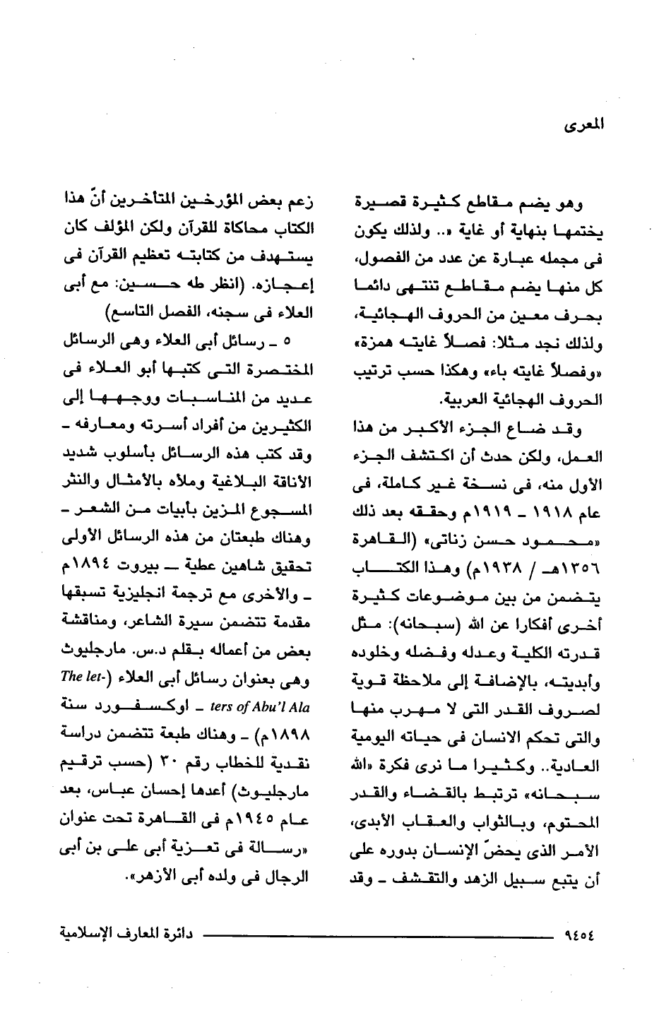 وقد ضاع الجزء الأكبر من هذا العمل، ولكن حدث أن اكتشف الجزء الأول منه، فى نسخة غير كاملة، فى عام 1918 - 1919 وحققه بعد ذلك "محمود حسن زناتى" (القاهرة 1356 هـ/ 1938 م) وهذا الكتاب يتضمن من بين موضوعات كثيرة أخرى أفكارًا عن اللَّه (سبحانه): مثل قدرته الكلية وعدله وفضله وخلوده وأبديته، بالإضافة إلى ملاحظة قوية لصروف القدر التى لا مهرب منها والتى تحكم الإنسان فى حياته اليومية العادية. . وكثيرًا ما نرى فكرة "اللَّه سبحانه" ترتبط بالقضاء والقدر المحتوم، وبالثواب والعقاب الأبدى، الأمر الذى يحضن الإنسان بدوره على أن يتبع سبيل الزهد والتقشف -وقد زعم بعض المؤرخين المتأخرين أنّ هذا الكتاب محاكاة للقرآن ولكن المؤلف كان يستهدف من كتابته تعظيم القرآن فى إعجازه. (انظر طه حسين: مع أبى العلاء فى سجنه، الفصل التاسع)