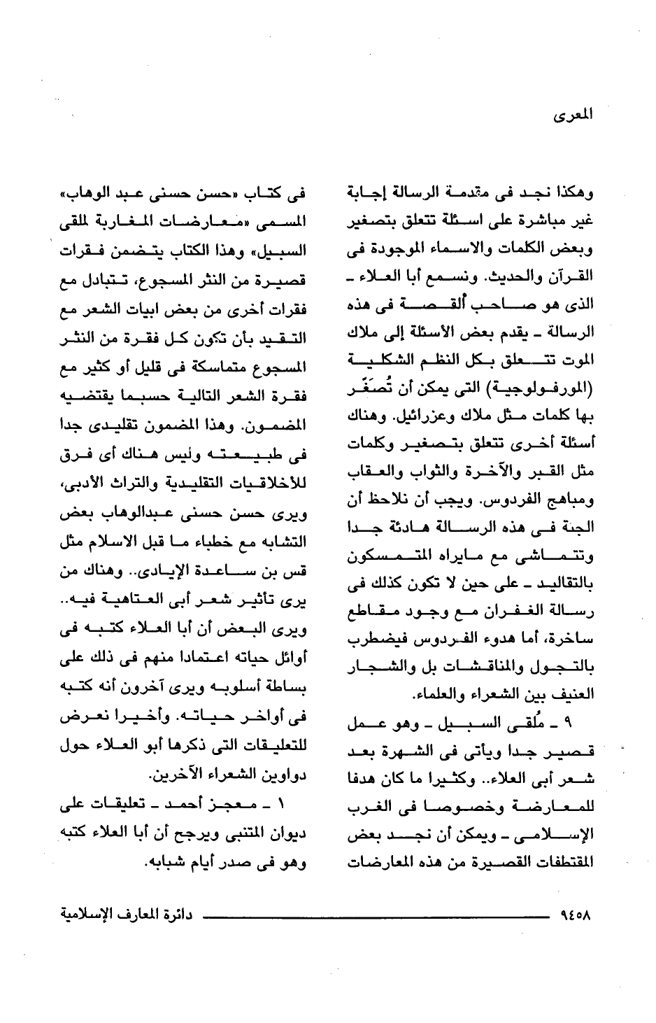 9 - مُلقى السبيل -وهو عمل قصير جدا ويأتى فى الشهرة بعد شعر أبى العلاء. . وكثيرا ما كان هدفا للمعارضة وخصوصا فى الغرب الإسلامى- ويمكن أن نجد بعض المقتطفات القصيرة من هذه المعارضات فى كتاب "حسن حسنى عبد الوهاب" المسمى "معارضات المغاربة لملقى السبيل" وهذا الكتاب يتضمن فقرات قصيرة من النثر المسجوع، تتبادل مع فقرات أخرى من بعض أبيات الشعر مع التقيد بأن تكون كل فقرة من النثر المسجوع متماسكة فى قليل أو كثير مع فقرة الشعر التالية حسبما يقتضيه المضمون. وهذا المضمون تقليدى جدًا فى طبيعته وليس هناك أى فرق للأخلاقيات التقليدية والتراث الأدبى، ويرى حسن حسنى عبد الوهاب بعض التشابه مع خطباء ما قبل الإسلام مثل قس بن ساعدة الإيادى. . وهناك من يرى تأثير شعر أبى العتاهية فيه. . ويرى البعض أن أبا العلاء كتبه فى أوائل حياته اعتمادًا منهم فى ذلك على بساطة أسلوبه ويرى آخرون أنه كتبه فى أواخر حياته. وأخيرًا نعرض للتعليقات التى ذكرها أبو العلاء حول دواوين الشعراء الآخرين: