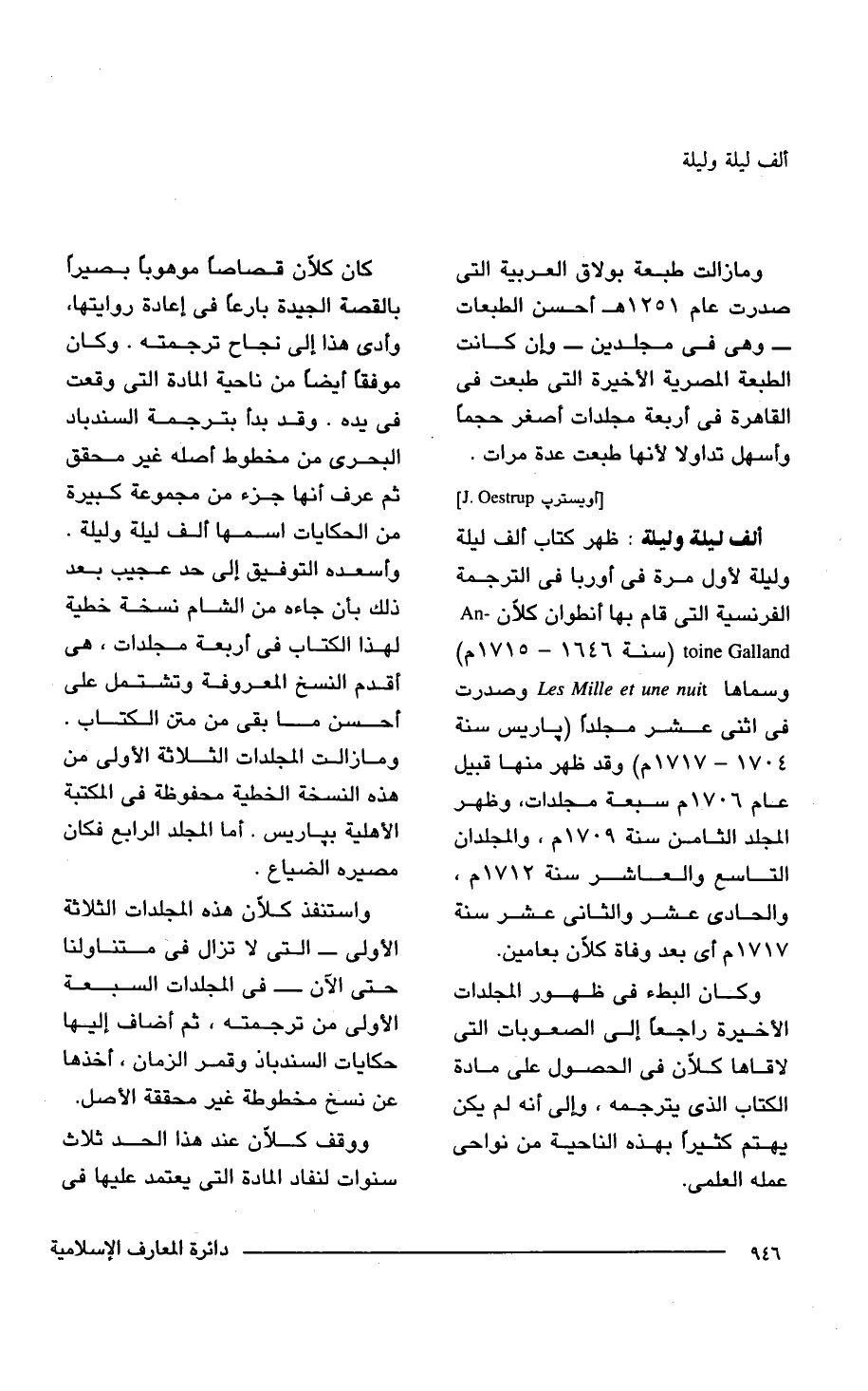 ألف ليلة وليلة: ظهر كتاب ألف ليلة وليلة لأول مرة فى أوربا فى الترجمة الفرنسية التى قام بها أنطوان كلّان - An toine Galland (سنة 1646 - 1715 م) وسماها Les Mille et une nuit وصدرت فى اثنى عشر مجلداً (باريس سنة 1704 - 1717 م) وقد ظهر منها قبيل عام 1706 م سبعة مجلدات، وظهر المجلد الثامن سنة 1709 م، والمجلدان التاسع والعاشر سنة 1712 م، والحادى عشر والثانى عشر سنة 1717 م أى بعد وفاة كلّان بعامين.