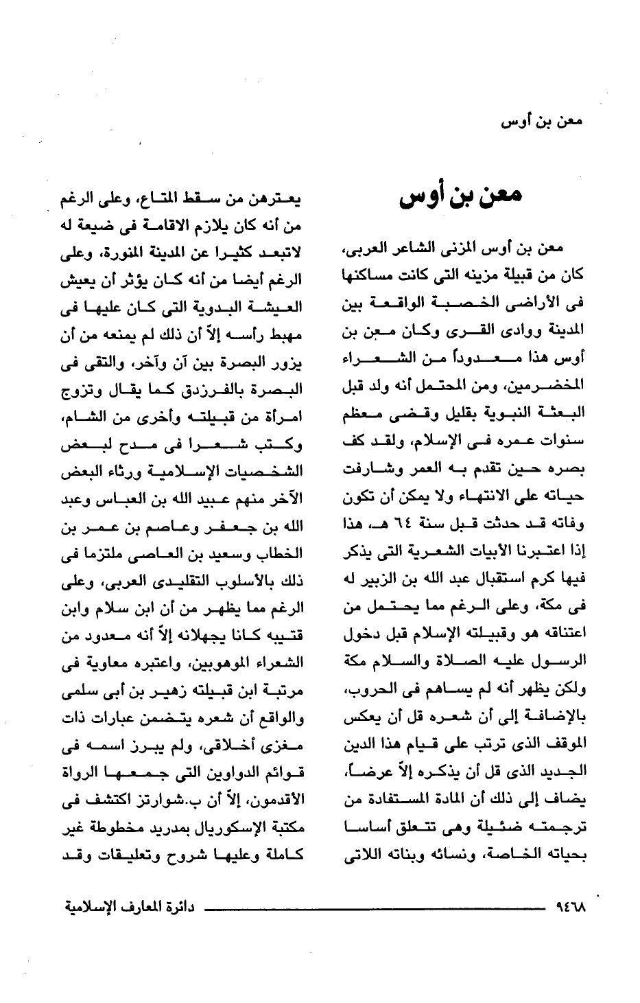 معن بن أوس المزنى الشاعر العربى، كان من قبيلة مزينه التى كانت مساكنها فى الأراضى الخصبة الواقعة بين المدينة ووادى القرى وكان معن بن أوس هذا معدودًا من الشعراء المخضرمين، ومن المحتمل أنه ولد قبل البعثة النبوية بقليل وقضى معظم سنوات عمره فى الإسلام، ولقد كف بصره حين تقدم به العمر وشارفت حياته على الانتهاء ولا يمكن أن تكون وفاته قد حدثت قبل سنة 64 هـ، هذا إذا اعتبرنا الأبيات الشعرية التى يذكر فيها كرم استقبال عبد اللَّه بن الزبير له فى مكة، وعلى الرغم مما يحتمل من اعتناقه هو وقبيلته الإسلام قبل دخول الرسول عليه الصلاة والسلام مكة ولكن يظهر أنه لم يساهم فى الحروب، بالإضافة إلى أن شعره قل أن يعكس الموقف الذى ترتب على قيام هذا الدين الجديد الذى قل أن يذكره إلّا عرضًا، يضاف إلى ذلك أن المادة المستفادة من ترجمته ضئيلة وهى تتعلق أساسًا بحياته الخاصة، ونسائه وبناته اللاتى يعترهن من سقط المتاع، وعلى الرغم من أنه كان يلازم الاقامة فى ضيعة له لا تبعد كثيرا عن المدينة المنورة، وعلى الرغم أيضًا من أنه كان يؤثر أن يعيش العيشة البدوية التى كان عليها فى مهبط رأسه إلا أن ذلك لم يمنعه من أن يزور البصرة بين أن وآخر، والتقى فى البصرة بالفرزدق كما يقال وتزوج امرأة من قبيلته وأخرى من الشام، وكتب شعرا فى مدح لبعض الشخصيات الإسلامية ورثاء البعض الآخر منهم عبيد اللَّه بن العباس وعبد اللَّه بن جعفر وعاصم بن عمر بن الخطاب وسعيد بن العاصى ملتزما فى ذلك بالأسلوب التقليدى العربى، وعلى الرغم مما يظهر من أن ابن سلام وابن قتيبه كانا يجهلانه إلا أنه معدود من الشعراء الموهوبين، واعتبره معاوية فى مرتبة ابن قبيلته زهير بن أبى سلمى والواقع أن شعره يتضمن عبارات ذات مغزى أخلاقى، ولم يبرز اسمه فى قوائم الدواوين التى جمعها الرواة الأقدمون، إلا أن ب. شوارتز اكتشف فى مكتبة الإسكوريال بمدريد مخطوطة غير كاملة وعليها شروح وتعليقات وقد
