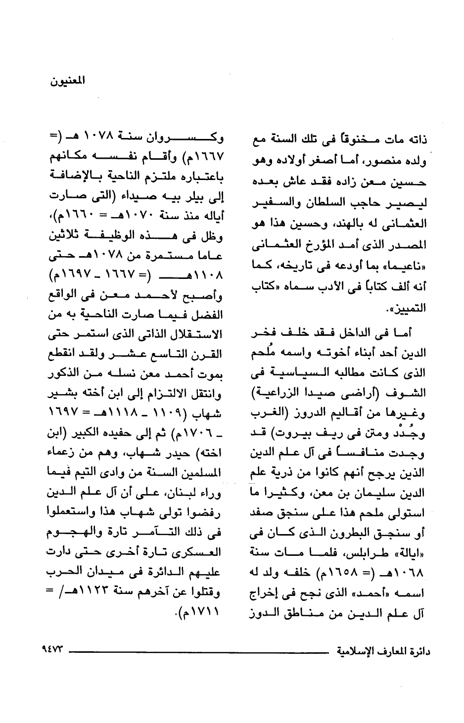 أما فى الداخل فقد خلف فخر الدين أحد أبناء أخوته واسمه مُلحم الذى كانت مطالبه السياسية فى الشوف (أراضى صيدا الزراعية) وغيرها من أقاليم الدروز (الغرب وجُدْد ومتن فى ريف بيروت) قد وجدت منافسًا فى آل علم الدين الذين يرجح أنهم كانوا من ذرية علم الدين سليمان بن معن، وكثيرا ما استولى ملحم هذا على سنجق صفد أو سنجق البطرون الذى كان فى "ايالة" طرابلس، فلما مات سنة 1068 هـ (= 1658 م) خلفه ولد له اسمه "أحمد" الذى نجح فى إخراج آل علم الدين من مناطق الدوز وكسروان سنة 1078 هـ (= 1667 م) وأقام نفسه مكانهم باعتباره ملتزم الناحية بالإضافة إلى بيلر بيه صيداء (التى صارت أياله منذ سنة 1070 هـ (= 1660 م)، وظل فى هذه الوظيفة ثلاثين عامًا مستمرة من 1078 هـ حتى 1108 هـ = (1667 - 1697 م) وأصبح لأحمد معن فى الواقع الفضل فيما صارت الناحية به من الاستقلال الذاتى الذى استمر حتى القرن التاسع عشر ولقد انقطع بموت أحمد معن نسله من المذكور وانتقل الالتزام إلى ابن أخته بشير شهاب (1109 - 1118 هـ = 1697 - 1706 م) ثم إلى حفيده الكبير (ابن اخته) حيدر شهاب، وهم من زعماء المسلمين السنة من وادى التيم فيما وراء لبنان، على أن آل علم الدين رفضوا تولى شهاب هذا واستعملوا فى ذلك التآمر تارة والهجوم العسكرى تارة أخرى حتى دارت عليهم الدائرة فى ميدان الحرب وقتلوا عن آخرهم سنة 1123 هـ (= 1711 م).