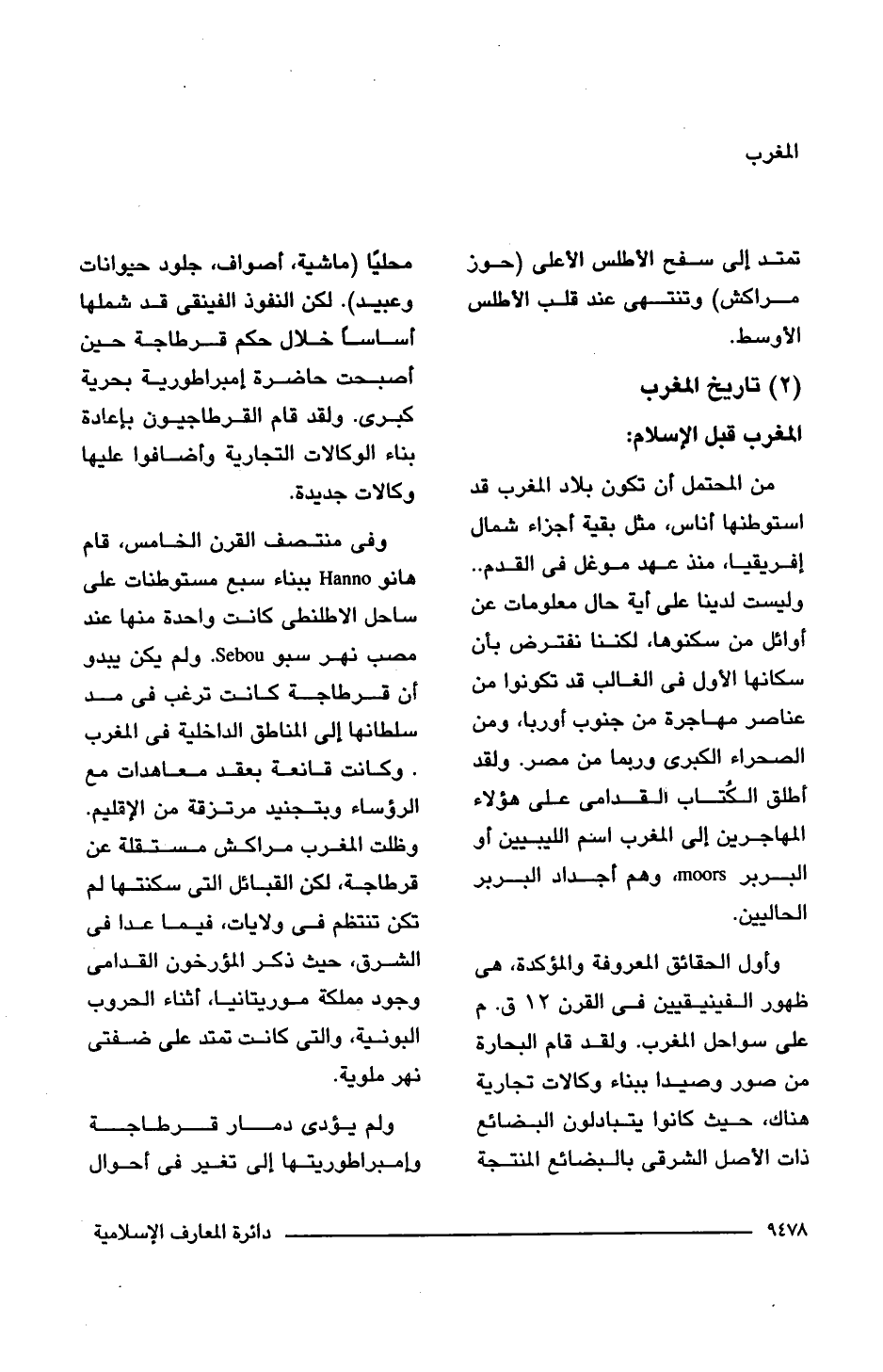 وفى منتصف القرن الخامس، قام هانو Hanna ببناء سبع مستوطنات على ساحل الأطلنطى كانت واحدة منها عند مصب نهر سبو Sebou. ولم يكن يبدو أن قرطاجة كانت ترغب فى مد سلطانها إلى المناطق الداخلية فى المغرب وكانت قانعة بعقد معاهدات مع الرؤساء وبتجنيد مرتزقة من الإقليم. وظلت المغرب مراكش مستقلة عن قرطاجة، لكن القبائل التى سكنتها لم تكن تنتظم فى ولايات، فيما عدا فى الشرق، حيث ذكر المؤرخون القدامى وجود مملكة موريتانيا، أثناء الحروب البونية، والتى كانت تمتد على ضفتى نهر ملوية.
