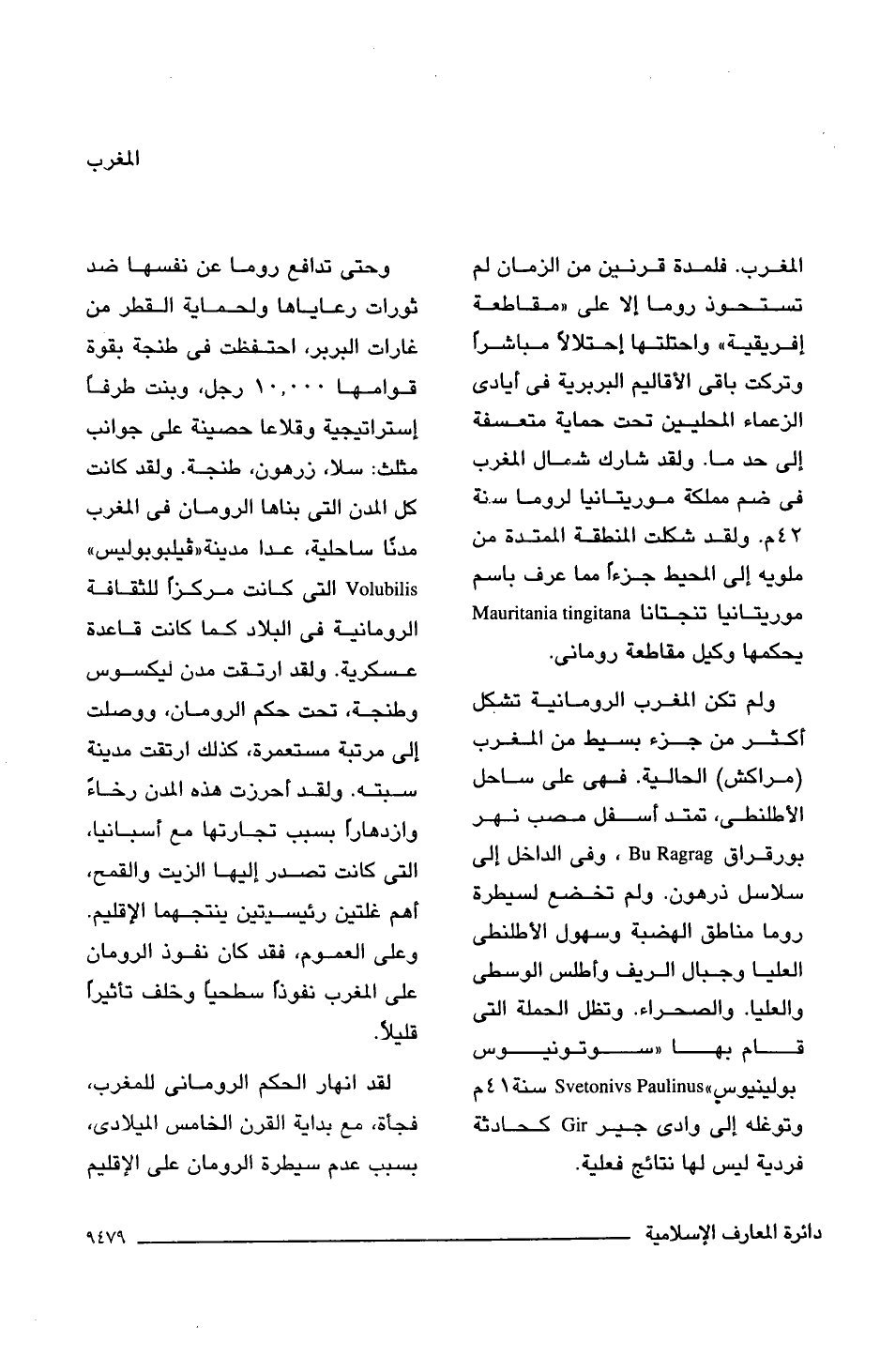 ولم تكن المغرب الرومانية تشكل أكثر من جزء بسيط من المغرب (مراكش) الحالية. فهى على ساحل الأطلنطى، تمتد أسفل مصب نهر بورقراق Bu Ragrag، وفى الداخل إلى سلاسل ذرهون. ولم تخضع لسيطرة روما مناطق الهضبة وسهول الأطلنطى العليا وجبال الريف وأطلس الوسطى والعليا. والصحراء. وتظل الحملة التى قام بها "سوتونيوس بولينيوس" Svetonivs Paulinusc سنة 41 م وتوغله إلى وادى جير Gir كحادثة فردية ليس لها نتائج فعلية.