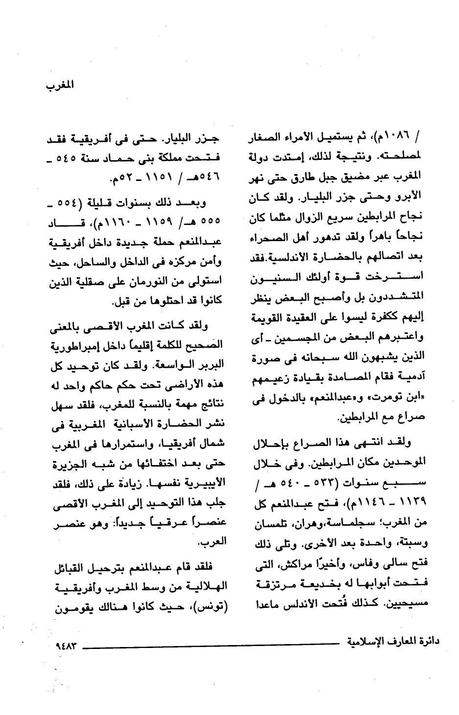 / 1086 م)، ثم يستميل الأمراء الصغار لمصلحته. ونتيجة لذلك، امتدت دولة المغرب عبر مضيق جبل طارق حتى نهر الأبرو وحتى جزر البليار. ولقد كان نجاح المرابطين سريع الزوال مثلما كان نجاحًا باهرًا ولقد تدهور أهل الصحراء بعد اتصالهم بالحضارة الأندلسية. فقد استرخت قوة أولئك السنيون المتشددون بل وأصبح البعض ينظر إليهم ككفرة ليسوا على العقيدة القويمة واعتبرهم البعض من المجسمين -أى الذين يشبهون اللَّه سبحانه فى صورة آدمية فقام المصامدة بقيادة زعيمهم "ابن تومرت" و"عبد المنعم" بالدخول فى صراع مع المرابطين.