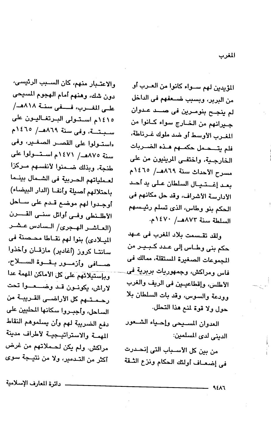 المؤيدين لهم سواء كانوا من العرب أو من البربر، وبسبب ضعفهم فى الداخل لم ينجح بنو مرين فى صد عدوان جيرانهم من الخارج سواء كانوا من المغرب الأوسط أو ضد ملوك غرناطة، فلم يتحمل حكمهم هذه الضربات الخارجية، واختفى المرينيون من على مسرح الأحداث سنة 869 هـ/ 1465 م بعد إغتيال السلطان على يد أحد الأدارسة الأشراف، وقد حل مكانهم فى الحكم بنو وطاس، الذى شملم رئيسهم السلطة سنة 873 هـ/ 1470 م