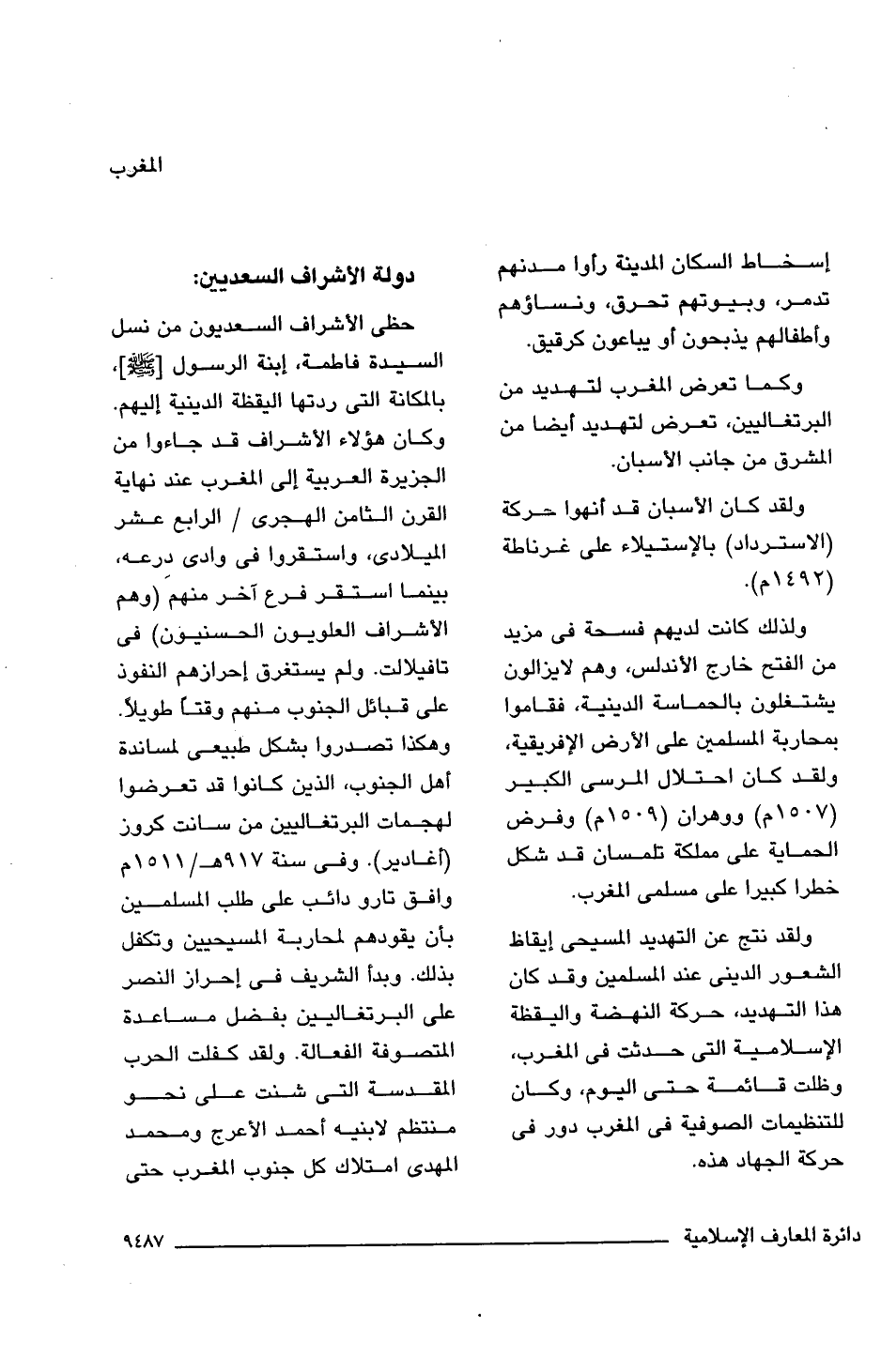 حظى الأشراف السعديون من نسل السيدة فاطمة، ابنة الرسول [-صلى اللَّه عليه وسلم-]، بالمكانة التى ردتها اليقظة الدينية إليهم. وكان هؤلاء الأشراف قد جاءوا من الجزيرة العربية إلى المغرب عند نهاية القرن الثامن الهجرى/ الرابع عشر الميلادى، واستقروا فى وادى دِرعه، بينما استقر فرع آخر منهم (وهم الأشراف العلويون الحسنيون) فى تافيلالت. ولم يستغرق إحرازهم النفوذ على قبائل الجنوب منهم وقتًا طويلًا. وهكذا تصدروا بشكل طبيعى لمساندة أهل الجنوب، الذين كانوا قد تعرضوا لهجمات البرتغاليين من سانت كروز (أغادير). وفى سنة 917 هـ/ 1511 م وافق تارو دائب على طلب المسلمين بأن يقودهم لمحاربة المسيحيين وتكفل بذلك. وبدأ الشريف فى إحراز النصر على البرتغاليين بفضل مساعدة المتصوفة الفعالة. ولقد كفلت الحرب المقدسة التى شنت على نحو منتظم لابنيه أحمد الأعرج ومحمد المهدى امتلاك كل جنوب المغرب حتى