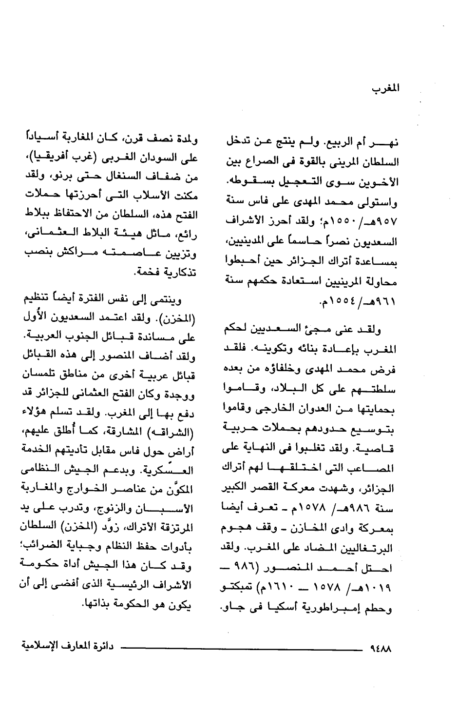 نهر أم الربيع. ولم ينتج عن تدخل السلطان المرينى بالقوة فى الصراع بين الأخوين سوى التعجيل بسقوطه. واستولى محمد المهدى على فاس سنة 957 هـ/ 1550 م؛ ولقد أحرز الأشراف السعديون نصرًا حاسمًا على المدينيين، بمساعدة أتراك الجزائر حين أحبطوا محاولة المرينيين استعادة حكمهم سنة 961 هـ/ 1554 م.