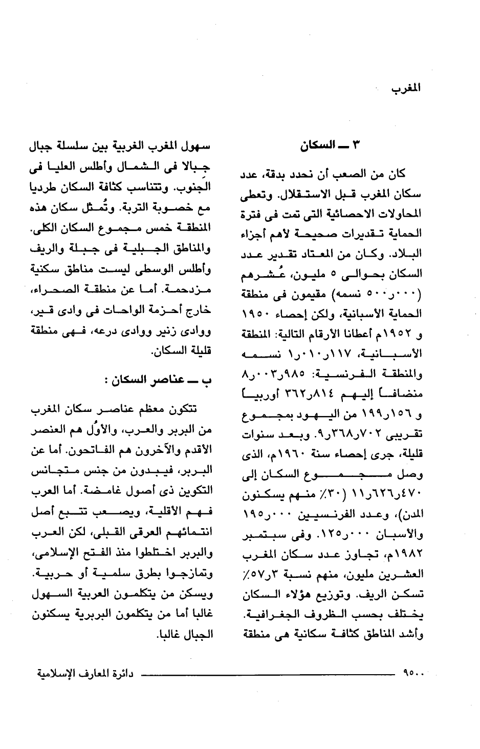 كان من الصعب أن نحدد بدقة، عدد سكان المغرب قبل الاستقلال. وتعطى المحاولات الاحصائية التى تمت فى فترة الحماية تقديرات صحيحة لأهم أجزاء البلاد. وكان من المعتاد تقدير عدد السكان بحوالى 5 مليون، عُشرهم (500.000 نسمة) مقيمون فى منطقة الحماية الأسبانية، ولكن إحصاء 1950 و 1952 م أعطانا الأرقام التالية: المنطقة الأسبانية، 1.010.117 نسمة والمنطقة الفرنسية: 8.003.985 منضافًا إليهم 362.814 أوربيًا و 199.156 من اليهود بمجموع تقريبى 9.368.702. وبعد سنوات قليلة، جرى إحصاء سنة 1960 م، الذى وصل مجموع السكان إلى 11.626.470 (30 % منهم يسكنون المدن)، وعدد الفرنسيين 195.000 والأسبان 125.000. وفى سبتمبر 1982 م، تجاوز عدد سكان المغرب العشرين مليون، منهم نسبة 57.3 % تسكن الريف. وتوزيع هؤلاء السكان يختلف بحسب الظروف الجغرافية. وأشد المناطق كثافة سكانية هى منطقة سهول المغرب الغربية بين سلسلة جبال جبالا فى الشمال وأطلس العليا فى الَجنوب. وتتناسب كثافة السكان طرديا مع خصوبة التربة. وتُمثل سكان هذه المنطقة خمس مجموع السكان الكلى. والمناطق الجبلية فى جبلة والريف وأطلس الوسطى ليست مناطق سكنية مزدحمة. أما عن منطقة الصحراء، خارج أحزمة الواحات فى وادى قير، ووادى زنير ووادى درعه، فهى منطقة قليلة السكان.