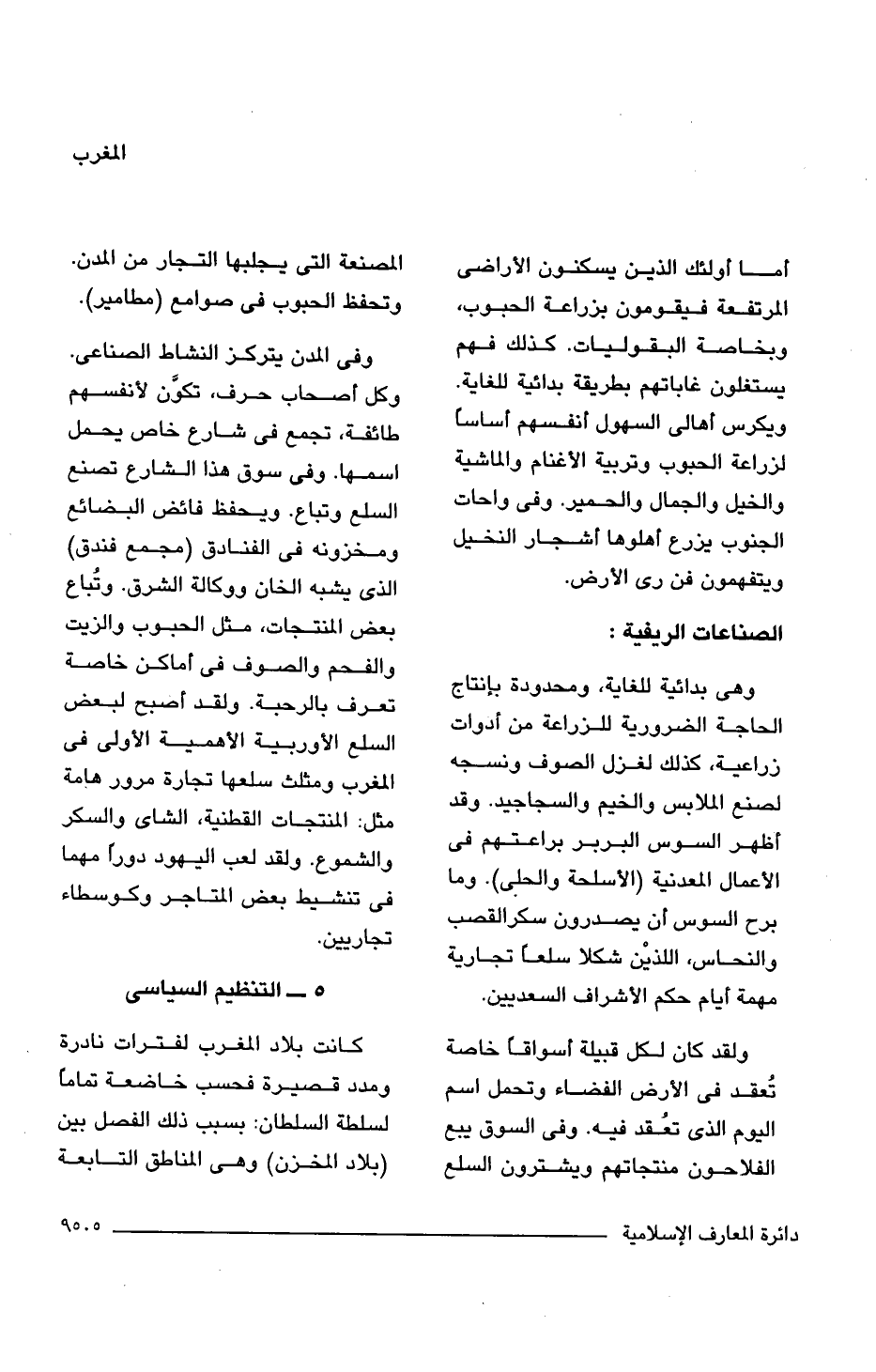 وفى المدن يتركز النشاط الصناعى. وكل أصحاب حرف، تكوَّن لأنفسهم طائفة، تجمع فى شارع خاص يحمل اسمها. وفى سوق هذا الشارع تصنع السلع وتباع. ويحفظ فائض البضائع ومخزونه فى الفنادق (مجمع فندق) الذى يشبه الخان ووكالة الشرق. وتُباع بعض المنتجات، مثل الحبوب والزيت والفحم والصوف فى أماكن خاصة تعرف بالرحبة. ولقد أصبح لبعض السلع الأوربية الأهمية الأولى فى المغرب ومثلث سلعها تجارة مرور هامة مثل: المنتجات القطنية، الشاى والسكر والشموع. ولقد لعب اليهود دورًا مهما فى تنشيط بعض المتاجر وكوسطاء تجاريين.