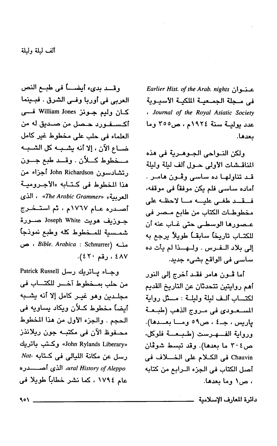 عنوان Earlier Hist. of the Arab. nights فى مجلة الجمعية الملكية الأسيوية Journal of the Royal Asiatic Society، عدد يولية سنة 1942 م، ص 355 وما بعدها.