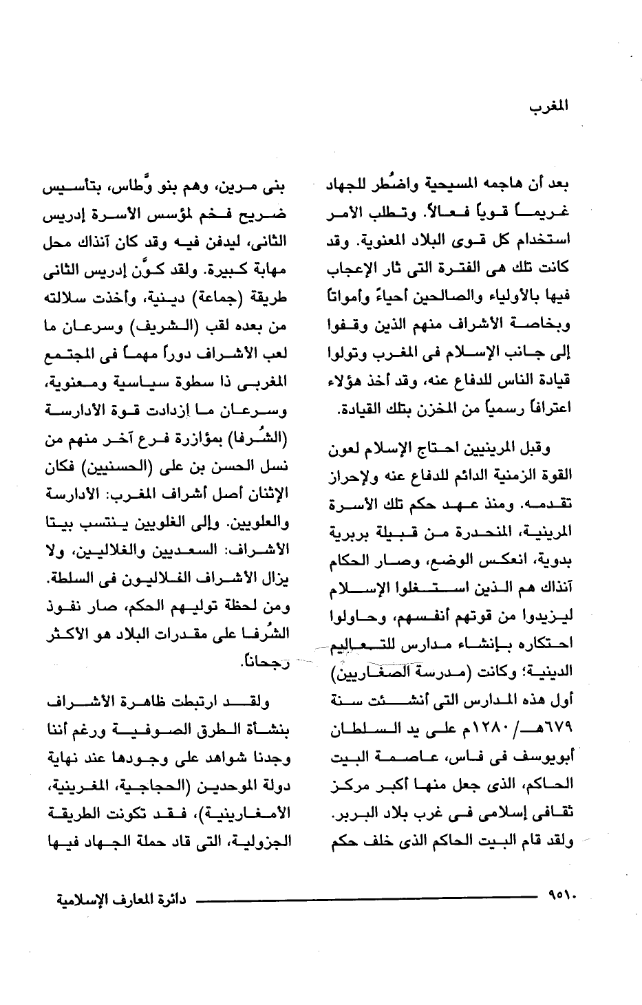 وقبل المرينيين احتاج الإسلام لعون القوة الزمنية الدائم للدفاع عنه ولإحراز تقدمه. ومنذ عهد حكم تلك الأسرة المرينية، المنحدرة من قبيلة بربرية بدوية، انعكس الوضع، وصار الحكام آنذاك هم الذين استغلوا الإسلام ليزيدوا من قوتهم أنفسهم، وحاولوا احتكاره بإنشاء مدارس للتعاليم الدينية؛ وكانت (مدرسة الصغاريين) أول هذه المدارس التى أنشئت سنة 679 هـ/ 1280 م على يد السلطان أبو يوسف فى فاس، عاصمة البيت الحاكم، الذى جعل منها أكبر مركز ثقافى إسلامى فى غرب بلاد البربر. ولقد قام البيت الحاكم الذى خلف حكم بنى مرين، وهم بنو وَّطاس، بتأسيس ضريح فخم لمؤسس الأسرة إدريس الثانى، ليدفن فيه وقد كان آنذاك محل مهابة كبيرة. ولقد كوَّن إدريس الثانى طريقة (جماعة) دينية، وأخذت سلالته من بعده لقب (الشريف) وسرعان ما لعب الأشراف دورًا مهمًا فى المجتمع المغربى ذا سطوة سياسية ومعنوية، وسرعان ما إزدادت قوة الأدارسة (الشُرفا) بمؤازرة فرع آخر منهم من نسل الحسن بن على (الحسنيين) فكان الإثنان أصل أشراف المغرب: الأدارسة والعلويين. وإلى الغلويين ينتسب بيتا الأشراف: السعديين والغلاليين، ولا يزال الأشراف الفلاليون فى السلطة. ومن لحظة توليهم الحكم، صار نفوذ الشُرفا على مقدرات البلاد هو الأكثر رجحانًا.