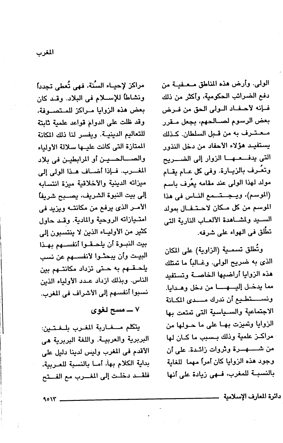 وتُطلق تسمية (الزاوية) على المكان الذى به ضريح الولى. وغالبًا ما تمتلك هذه الزوايا أراضيها الخاصة وتستفيد مما يدخل إليها من دخل وهدايا. ونستطيع أن ندرك مدى المكانة الاجتماعية والسياسية التى تمتعت بها الزوايا وتميزت بها على ما حولها من مراكز علمية وذلك بسبب ما كان لها من شهرة وثروات زائدة. على أن وجود هذه الزوايا كان أمرًا مهما للغاية بالنسبة للمغرب، فهى زيادة على أنها مراكز لإحياء السنة، فهى تُعطى تجددًا ونشاطًا للإسلام فى البلاد. وقد كان بعض هذه الزوايا مراكز للمتصوفة، وقد ظلت على الدوام قواعد علمية ثابتة للتعاليم الدينية. ويفسر لنا ذلك المكانة الممتازة التى كانت عليها سلالة الأولياء والصالحين أو المرابطين فى بلاد المغرب. فإذا أضاف هذا الولى إلى ميزاته الدينية والأخلاقية ميزة انتسابه إلى بيت النبوة الشريف، يصبح شريفًا الأمر الذى يرفع من مكانته ويزيد فى امتيازاته الروحية والمادية. وقد حاول كثير من الأولياء الذين لا ينتسبون إلى بيت النبوة أن يلحقوا أنفسهم بهذا البيت وأن يبحثوا لأنفسهم عن نسب يلحقهم به حتى تزداد مكانتهم بين الناس. وبذلك ازداد عدد الأولياء الذين نسبوا أنفسهم إلى الأشراف فى المغرب.