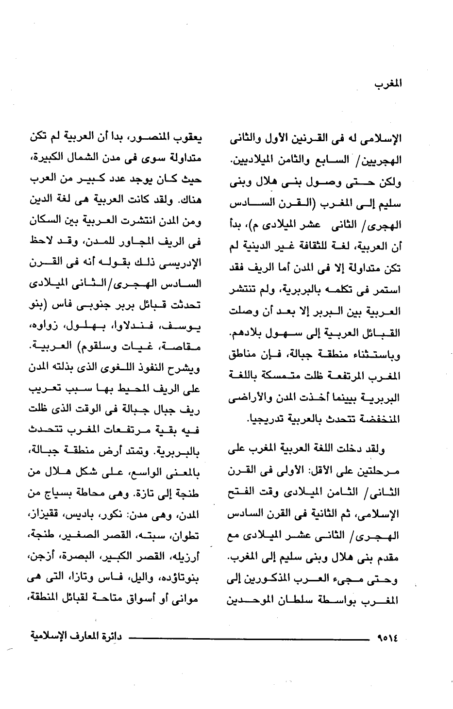 الإسلامى له فى القرنين الأول والثانى الهجريين/ السابع والثامن الميلاديين. ولكن حتى وصول بنى هلال وبنى سليم إلى المغرب (القرن السادس الهجرى/ الثانى عشر الميلادى)، بدأ أن العربية، لغة للثقافة غير الدينية لم تكن متداولة إلا فى المدن أما الريف فقد استمر فى تكلمه بالبربرية، ولم تنتشر العربية بين البربر إلا بعد أن وصلت القبائل العربية إلى سهول بلادهم. وباستثناء منطقة جبالة، فإن مناطق المغرب المرتفعة ظلت متمسكة باللغة البربرية بينما أخذت المدن والأراضى المنخفضة تتحدث بالعربية تدريجيا.