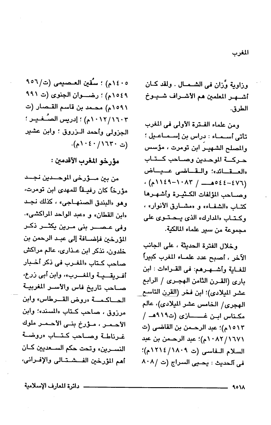 ومن علماء الفترة الأولى فى المغرب تأتى أسماء: دراس بن إسماعيل؛ والمصلح الشهير ابن تومرت، مؤسس حركة الموحدين وصاحب كتاب "العقائد"؛ والقاضى عياض (476 - 544 هـ/ 1083 - 1149 م)، وصاحب المؤلفات الكثيرة وأشهرها كتاب "الشفاء" و"مشارق الأنوار"، وكتاب "المدارك" الذى يحتوى على مجموعة من سير علماء المالكية.