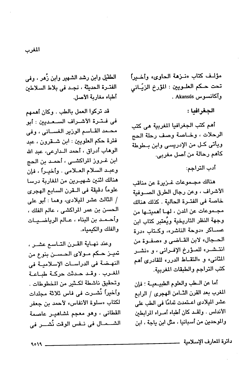 قد تركوا العمل بالطب. وكان أهمهم فى فترة الأشراف السعديين: أبو محمد القاسم الوزير الغسانى، وفى فترة حكم العلويين: ابن شقرون، عبد الوهاب أدراق، أحمد الدارعى، عبد اللَّه ابن غروز المراكشى، أحمد بن الحج وعبد السلام العلامى. وأخيرًا، فإن هنالك اثنين شهيرين من المغاربة درسا علومًا دقيقة فى القرن السابع الهجرى/ الثالث عشر الميلادى، وهما: أبو على الحسن بن عمر المراكشى، عالم الفلك، وأحمد بن البناء، عالم الرياضيات والفلك والكيمياء.