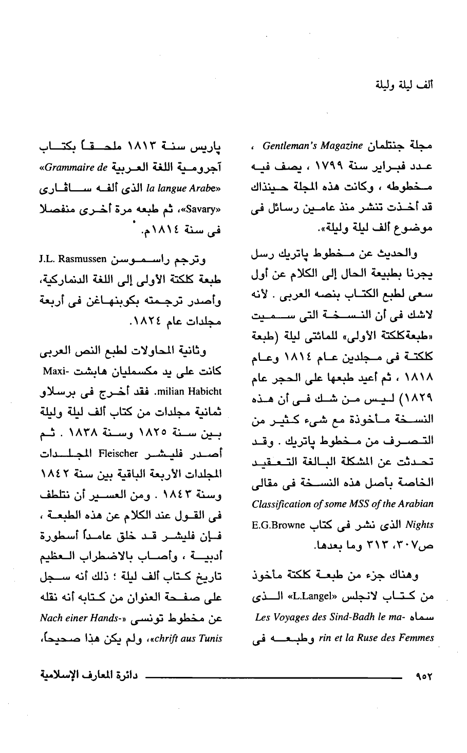 مجلة جنتلمان Gentleman's Magazine، عدد فبراير سنة 1799. يصف فيه مخطوطه، وكانت هذه المجلة حينذاك قد أخذت تنشر منذ عامين رسائل فى موضوع ألف ليلة وليلة".