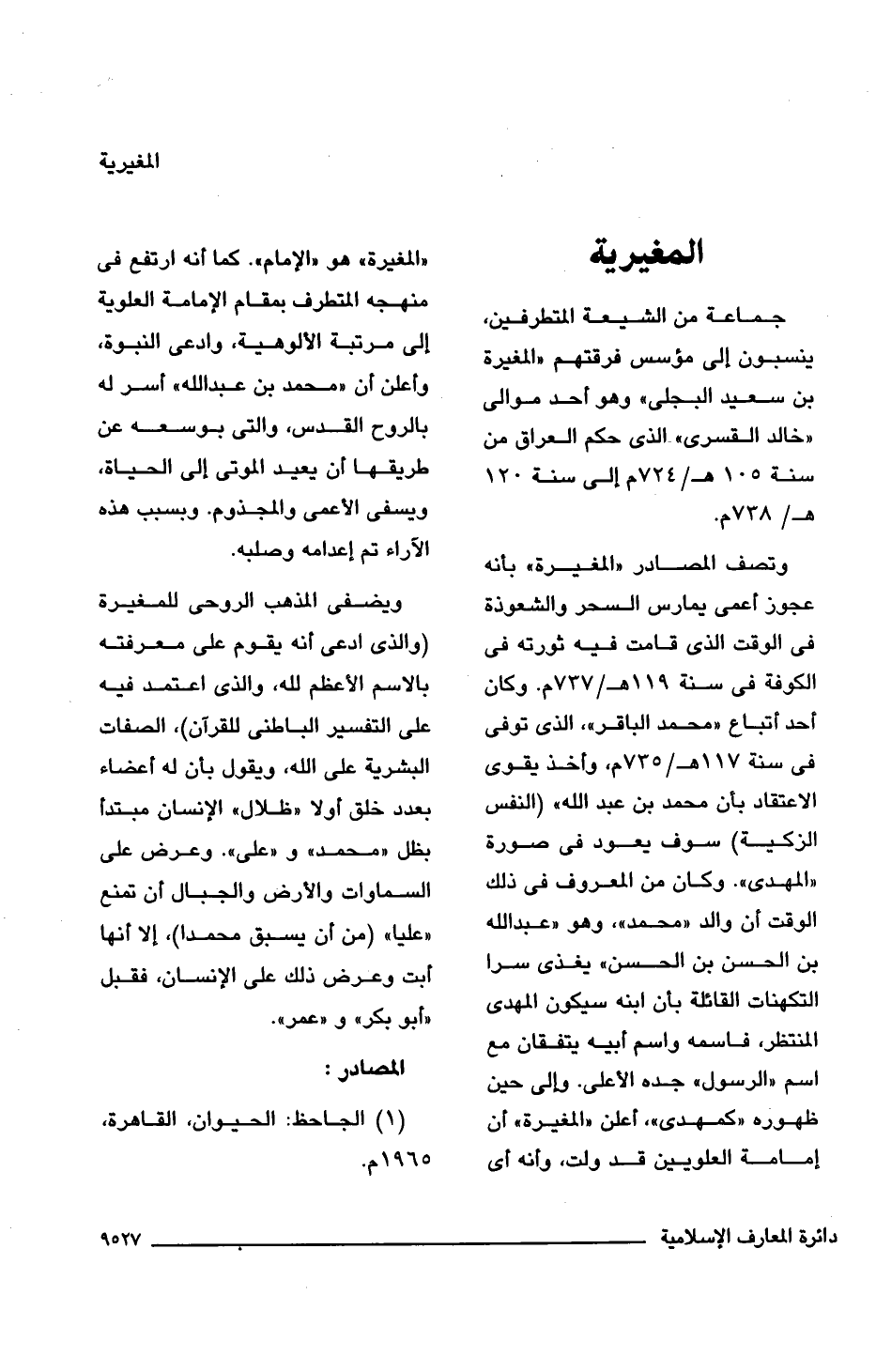 وتصف المصادر "المغيرة" بأنه عجوز أعمى يمارس السحر والشعوذة فى الوقت الذى قامت فيه ثورته فى الكوفة فى سنة 119 هـ/ 737 م. وكان أحد أتباع "محمد الباقر"، الذى توفى فى سنة 117 هـ/ 735 م، وأخذ يقوى الاعتقاد بأن محمد بن عبد اللَّه" (النفس الزكية) سوف يعود فى صورة "المهدى". وكان من المعروف فى ذلك الوقت أن والد "محمد"، وهو "عبد اللَّه بن الحسن بن الحسن" يغذى سرا التكهنات القائلة بأن ابنه سيكون المهدى المنتظر، فاسمه واسم أبيه يتفقان مع اسم الرسول" جده الأعلى. وإلى حين ظهوره "كمهدى"، أعلن "المغيرة" أن إمامة العلويين قد ولت، وأنه أى "المغيرة" هو "الإمام". كما أنه ارتفع فى منهجه المتطرف بمقام الإمامة العلوية إلى مرتبة الألوهية، وادعى النبوة، وأعلن أن "محمد بن عبد اللَّه" أسر له بالروح القدس، والتى بوسعه عن طريقها أن يعيد الموتى إلى الحياة، ويسفى الأعمى والمجذوم. وبسبب هذه الآراء تم إعدامه وصلبه.