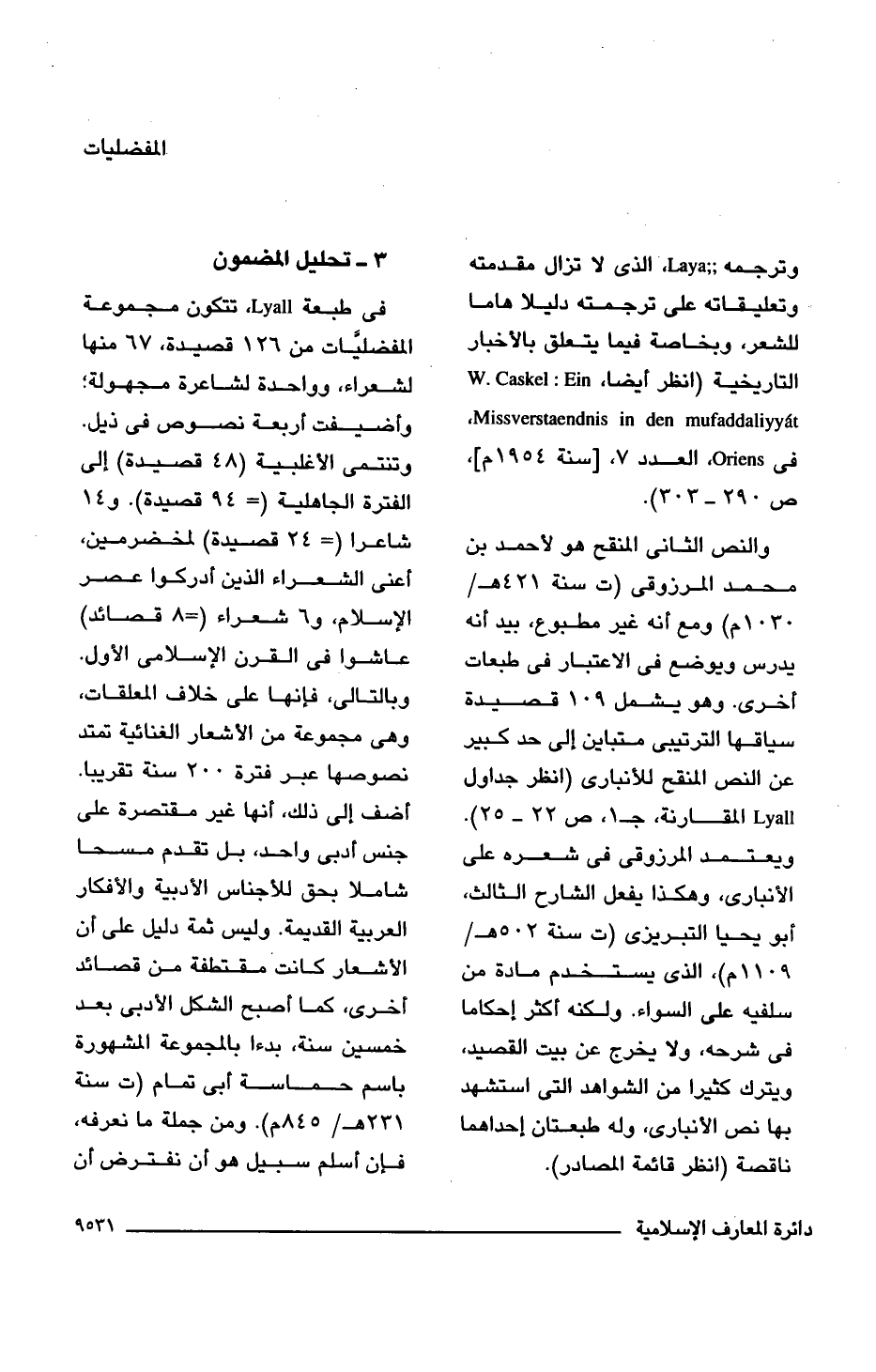وترجمه Laya، الذى لا تزال مقدمته وتعليقاته على ترجمته دليلا هاما للشعر، وبخاصة فيما يتعلق بالأخبار التاريخية (انظر أيضًا, W. Caskel: Ein Missverstaendnis in den mufaddaliyyat، فى Oriens، العدد 7، [سنة 1954 م]، ص 290 - 303).