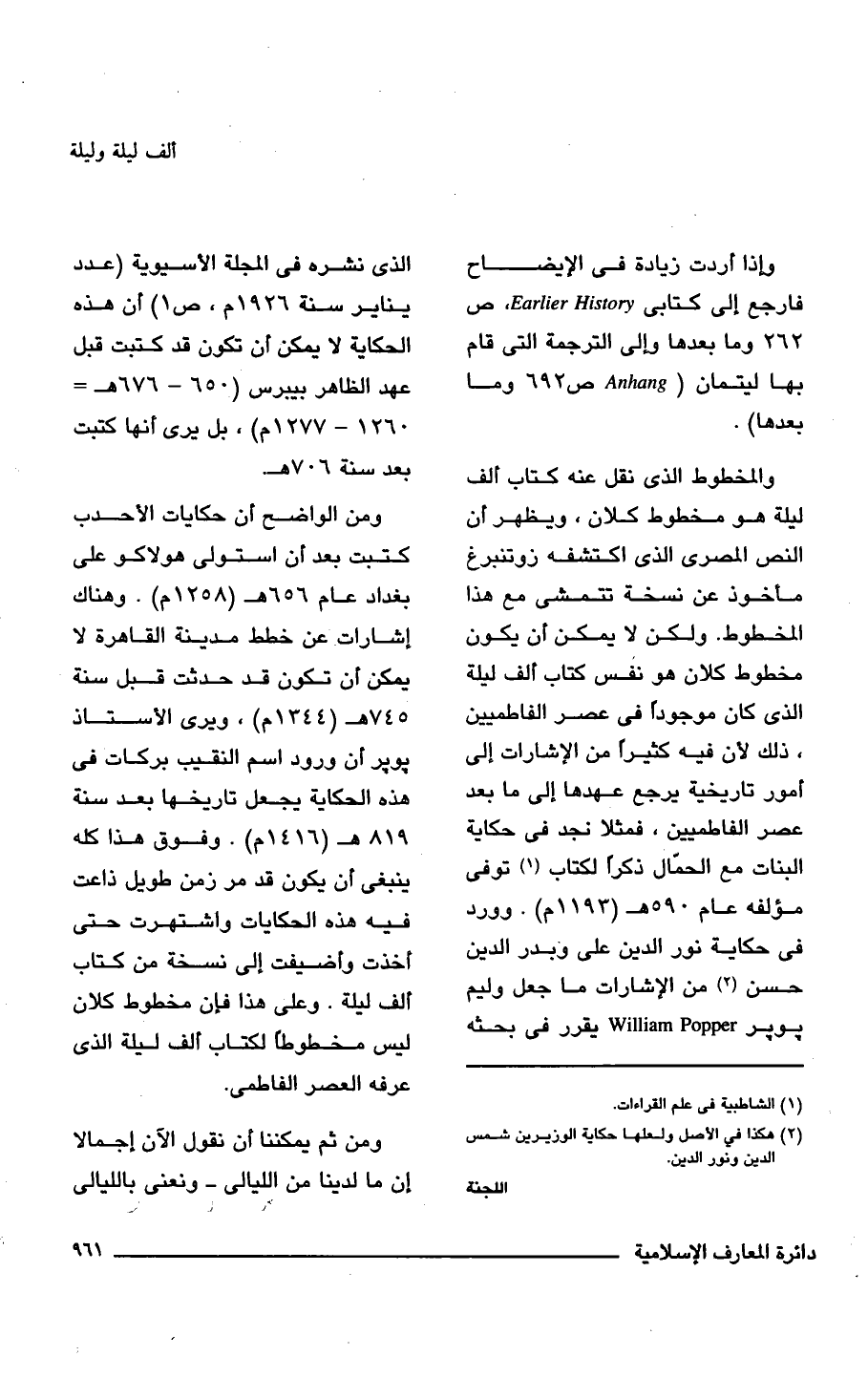 والمخطوط الذى نقل عنه كتاب ألف ليلة هو مخطوط كلّان، ويظهر أن النص المصرى الذى اكتشفه زوتنبرغ مأخوذ عن نسخة تتمشى مع هذا المخطوط. ولكن لا يمكن أن يكون مخطوط كلّان هو نفس كتاب ألف ليلة الذى كان موجوداً فى عصر الفاطميين، ذلك لأن فيه كثيراً من الإشارات إلى أمور تاريخية يرجع عهدها إلى ما بعد عصر الفاطميين، فمثلا نجد فى حكاية البنات مع الحمال ذكراً لكتاب (¬1) توفى مؤلفه عام 590 هـ) (1193 م). وورد فى حكاية نور الدين على وبدر الدين حسن (¬2) من الاشارات ما جعل وليم بوبر William Popper يقرر فى بحثه الذى نشره فى المجلة الأسيوية (عدد يناير سنة 1926 م، ص 1) أن هذه الحكاية لا يمكن أن تكون قد كتبت قبل عهد الظاهر بيبرس (650 - 676 هـ = 1260 - 1277 م) , بل يرى أنها كتبت بعد سنة 706 هـ.