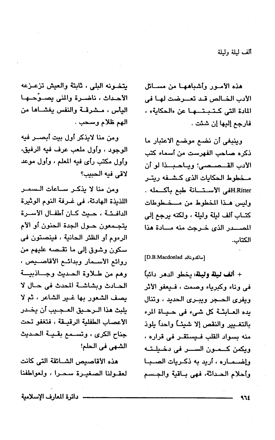 وينيغى أن نضع موضع الاعتبار ما ذكره صاحب الفهرست من أسماء كتب الأدب القصصى, وياحبذا لو أن مخطوط الحكايات الذى كشفه ريتر H.Ritter فى الأستانة طبع بأكمله. وليس هذا المخطوط من مخطوطات كتاب ألف ليلة وليلة، ولكنه يرجع إلى المصدر الذى خرجت منه مادة هذا الكتاب.