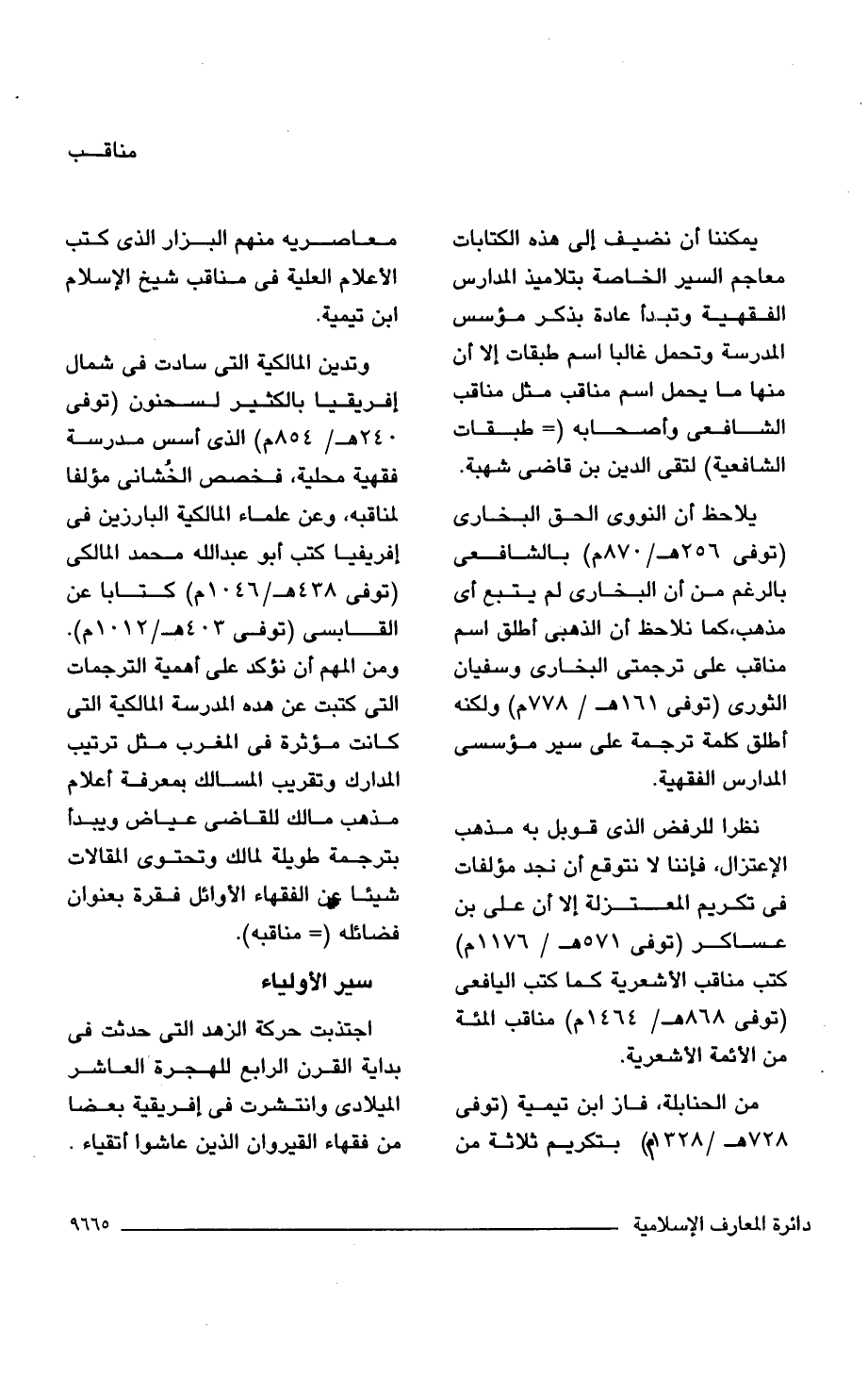 وتدين المالكية التى سادت فى شمال إفريقيا بالكثير لسحنون (توفى 240 هـ/ 854 م) الذى أسس مدرسة فقهية محلية، فخصص الخشانى مؤلفا لمناقبه، وعن علماء المالكية البارزين فى إفريقيا كتب أبو عبد اللَّه محمد المالكى (توفى 438/ 1046 م) كتابا عن القابسى (توفى 403 هـ/ 1012 م). ومن المهم أن نؤكد على أهمية الترجمات التى كتبت عن هذه المدرسة المالكية التى كانت مؤثرة فى المغرب مثل ترتيب المدارك وتقريب المسالك بمعرفة أعلام مذهب مالك للقاضى عياض ويبدأ بترجمة طويلة لمالك وتحتوى المقالات شيئا عن الفقهاء الأوائل فقرة بعنوان فضائله (= مناقبه).