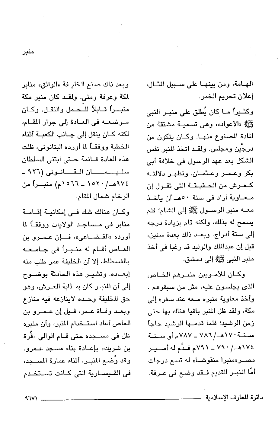وكثيرًا ما كان يُطلق على منبر النبى -صلى اللَّه عليه وسلم- "الأعواد"، وهى تسمية مشتقة من المادة المصنوع منها. وكان يتكون من درجْين ومجلس. ولقد اتخذ المنبر نفس الشكل بعد عهد الرسول فى خلافة أبى بكر وعمر وعثمان. وتظهر دلالته كعرش من الحقيقة التى تقول إن معاوية أراد فى سنة 50 هـ أن يأخذ معه منبر الرسول -صلى اللَّه عليه وسلم- إلى الشام "فلم يسمح له بذلك، ولكنه قام بزيادة درجه إلى ستة أدراج. وبعد ذلك بعدة سنين، قيل إن عبد الملك والوليد قد رغبا فى أخذ منبر النبى -صلى اللَّه عليه وسلم- إلى دمشق.