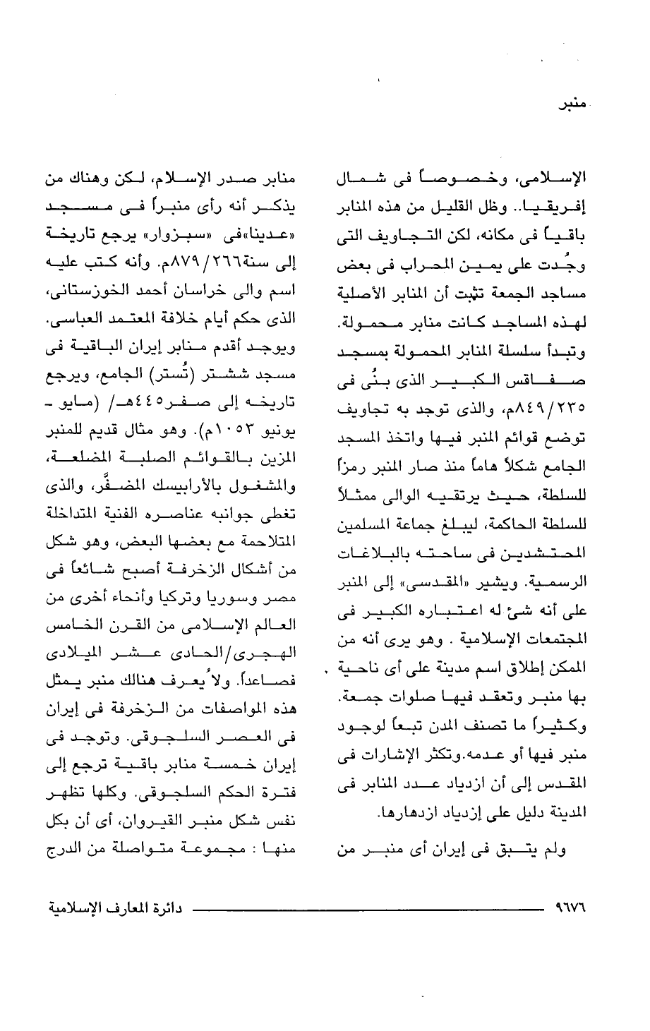 الإسلامى، وخصوصًا فى شمال إفريقيا. . وظل القليل من هذه المنابر باقيا فى مكانه، لكن التجاويف التى وجُدت على يمين المحراب فى بعض مساجد الجمعة تفت أن المنابر الأصلية لهذه المساجد كانت منابر محمولة. وتبدأ سلسلة المنابر المحمولة بمسجد صفاقس الكبير الذى بنى فى 235/ 849 م، والذى توجد به تجاويف توضع قوائم المنبر فيها واتخذ المسجد الجامع شكلًا هامًا منذ صار المنبر رمزًا للسلطة، حيث يرتقيه الوالى ممثلًا للسلطة الحاكمة، ليبلغ جماعة المسلمين المحتشدين فى ساحته بالبلاغات الرسمية. ويشير "المقدسى" إلى المنبر على أنه شئ له اعتباره الكبير فى المجتمعات الإسلامية. وهو يرى أنه من الممكن إطلاق اسم مدينة على أى ناحية، بها منبير وتعقد فيها صلوات جمعة. وكثيرًا ما تصنف المدن تبعًا لوجود منبر فيها أو عدمه. وتكثر الإشارات فى المقدس إلى أن ازدياد عدد المنابر فى المدينة دليل على إزدياد ازدهارها.