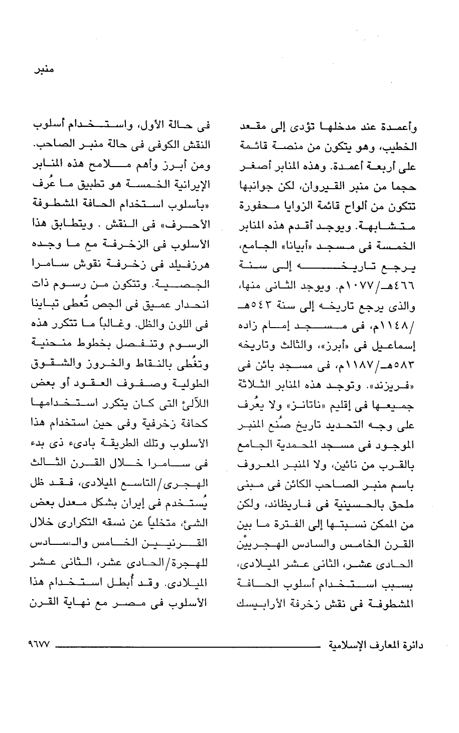 وأعمدة عند مدخلها تؤدى إلى مقعد الخطيب، وهو يتكون من منصة قائمة على أربعة أعمدة. وهذه المنابر أصغر حجما من منبر القيروان، لكن جوانبها تتكون من ألواح قائمة الزوايا محفورة متشابهة. ويوجد أقدم هذه المنابر الخمسة فى مسجد "أبيانا" الجامع، يرجع تاريخه إلى سنة 466 هـ/ 1077 م. ويوجد الثانى منها، والذى يرجع تاريخه إلى سنة 543 هـ/ 1148 م, فى مسجد إمام زاده إسماعيل فى "أبرز"، والثالث وتاريخه 583 هـ/ 1187، فى مسجد بائن فى "فريزند". وتوجد هذه المنابر الثلاثة جميعها فى إقليم "ناتانز" ولا يُعرف على وجه التحديد تاريخ صنع المنبر الموجود فى مسجد المحمدية الجامع بالقرب من نائين، ولا المنبر المعروف باسم منبر الصاحب الكائن فى مبنى ملحق بالحسينية فى فاريظاند، ولكن من الممكن نسبتها إلى الفترة ما بين القرن الخامس والسادس الهجريين الحادى عشر، الثانى عشر الميلادى، بسبب استخدام أسلوب الحافة المشطوفة فى نقش زخرفة الأرابيسك فى حالة الأول، واستخدام أسلوب النقش الكوفى فى حالة منبر الصاحب. ومن أبرز وأهم ملامح هذه المنابر الإيرانية الخمسة هو تطبيق ما عُرف "بأسلوب استخدام الحافة المشطوفة الأحرف" فى النقش. ويتطابق هذا الأسلوب فى الزخرفة مع ما وجده هرزفيلد فى زخرفة نقوش سامرا الجصية. وتتكون من رسوم ذات انحدار عميق فى الجص تُعطى تباينا فى اللون والظل. وغالبًا ما تتكرر هذه الرسوم وتنفصل بخطوط منحنية وتغطى بالنقاط والخروز والشقوق الطولية وصفوف العقود أو بعض اللآلئ التى كان يتكرر استخدامها كحافة زخرفية وفى حين استخدام هذا الأسلوب وتلك الطريقة بادئ ذى بدء فى سامرا خلال القرن الثالث الهجرى/ التاسع الميلادى، فقد ظل يستخدم فى إيران بشكل معدل بعض الشئ، متخليا عن نسقه التكرارى خلال القرنيين الخامس والسادس للهجرة/ الحادى عشر، الثانى عشر الميلادى. وقد أبطل استخدام هذا الأسلوب فى مصر مع نهاية القرن