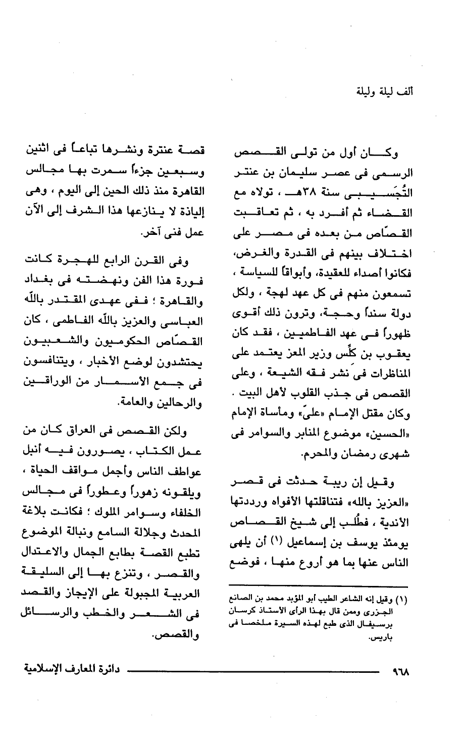 ولكن القصص فى العراق كان من عمل الكتاب، يصورون فيه أنبل عواطف الناس وأجمل مواقف الحياة، ويلقونه زهوراً وعطورا فى مجالس الخلفاء وسوامر الملوك , فكانت بلاغة المحدث وجلالة السامع ونبالة الموضوع تطبع القصة بطابع الجمال والاعتدال والقصر، وتنزع بها إلى السليقة العربية المجبولة على الإيجاز والقصد فى الشعر والخطب والرسائل والقصص.