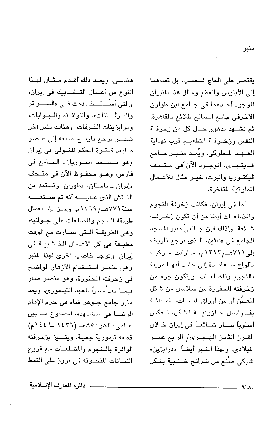 أما فى إيران، فكانت زخرفة النجوم والمضلعات أبطأ من أن تكون زخرفة شائعة. ولذلك فإن جانبى منبر المسجد الجامع فى "نائين" الذى يرجع تاريخه إلى 711 هـ/ 1312 م، ما زالت مركبة بألواح متعامدة إلى جانب أنها مزينة بالنجوم والمضلعات. ويتكون جزء من زخرفته المحفورة من سلاسل من شكل المعين أو من أوراق النبات، الممتلئة بفواصل حلزونية الشكل، تعكس أسلوبا صار شائعا فى إيران خلال القرن الثامن الهجرى/ الرابع عشر الميلادى. ولهذا المنبر أيضًا، "درابزين" شبكى صنع من شرائح خشبية بشكل هندسى. ويعد ذلك أقدم مثال لهذا النوع من أعمال التشابيك فى إيران، والتى أستخدمت فى "السواتر والبرفانات"، والنوافذ، والبوابات، ودرابزينات الشرفات. وهنالك منبر آخر شهير يرجع تاريخ صنعه إلى عصر ما بعد فترة الحكم المغولى فى إيران وهو مسجد "سوريان" الجامع فى فارس، وهو محفوظ الآن فى متحف "إيران - باستان" بطهران. ونستمد من النقش الذى عليه أنه تم صنعه سنة 771 هـ/ 1369 م. وتميز بإستعمال طريقة النجم والمضلعات على جوانبه، وهى الطريقة التى صارت مع الوقت مطبقة فى كل الأعمال الخشبية فى إيران. وتوجد خاصية أخرى لهذا المنبر وهى عنصر استخدام الأزهار الواضح فى زخرفته المحفورة، وهو عنصر صار فيما بعدُ مميزًا للعهد التيمورى. ويعد منبر جامع جوهر شاه فى حرم الإمام الرضا فى "مشهد"، المصنوع ما بين عامى 840 و 850 هـ (1436 - 1446 م) قطعة تيمورية جميلة. ويتميز بزخرفته الوافرة بالنجوم والمضلعات مع فروع النباتات المنحوته فى بروز على النمط