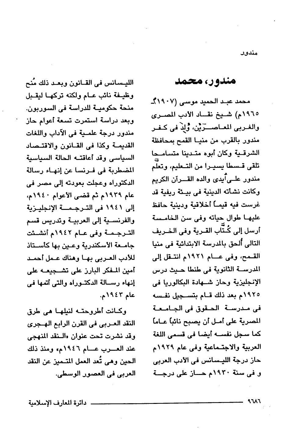 محمد عبد الحميد موسى (1907 م - 1965 م) شيخ نقاد الأدب المصرى والغربى المعاصرين، ولد فى كفر مندور بالقرب من منيا القمح بمحافظة الشرقية وكان أبوه متدينا متسامحا تلقى قسطا يسيرا من التعليم، وتعلَّم مندور على أيدى والده القرآن الكريم وكانت نشأته الدينية فى بيئة ريفية قد غرست فيه قيمًا اخلاقية ودينية حافظ عليها طوال حياته وفى سن الخامسة أرسل إلى كُتَّاب القرية وفى الخريف التالى ألحق بالمدرسة الابتدائية فى منيا القمح، وفى عام 1921 م انتقل إلى المدرسة الثانوية فى طنطا حيث درس الإنجليزية وحاز شهادة البكالوريا فى 1925 م بعد ذلك قام بتسجيل نفسه فى مدرسة الحقوق فى الجامعة المصرية على أمل أن يصبح نائبًا عامًا كما سجل نفسه أيضا فى قسمى اللغة العربية والاجتماعية وفى عام 1929 م حاز درجة الليسانس فى الأدب العربى وفى سنة 1930 م حاز على درجة الليسانس فى القانون وبعد ذلك مُنح وظيفة نائب عام ولكنه تركها ليقبل منحة حكومية للدراسة فى السوربون. وبعد دراسة استمرت تسعة أعوام حاز مندور درجة علمية فى الآداب واللغات القديمة وكذا فى القانون والاقتصاد السياسى وقد اعاقته الحالة السياسية المضطربة فى فرنسا عن إنهاء رسالة الدكتوراه وعجلت بعودته إلى مصر فى عام 1939 م ثم قضى الأعوام 1940 م، إلى 1941 فى الترجمة الإنجليزية والفرنسية إلى العربية وتدريس قسم الترجمة وفى عام 1942 م أنشئت جامعة الإسكندرية وعين بها كأستاذ للأدب العربى بها وهناك عمل أحمد آمين المفكر البارز على تشجيعه على انهاء رسالة دكتوراه والتى أتمها فى عام 1943 م.