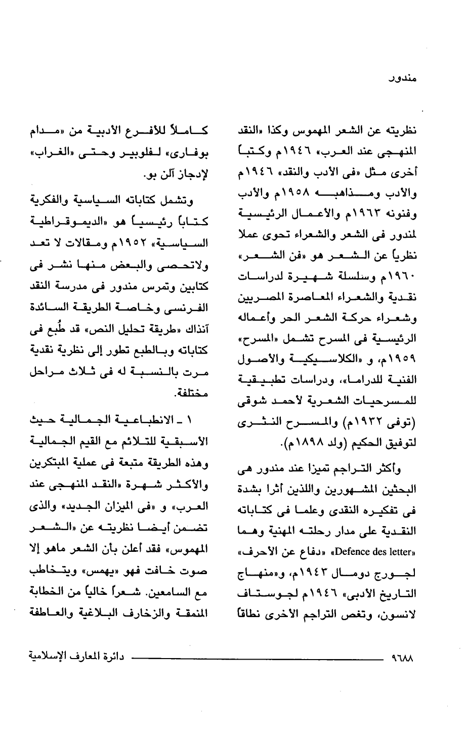 نظريته عن الشعر المهموس وكذا "النقد المنهجى عند العرب" 1946 م وكتبًا أخرى مثل "فى الأدب والنقد" 1946 م والأدب ومذاهبه 1958 م والأدب وفنونه 1936 م والأعمال الرئيسية لمندور فى الشعر والشعراء تحوى عملا نظريًا عن الشعر هو "فن الشعر" 1960 م وسلسلة شهيرة لدراسات نقدية والشعراء المعاصرة المصريين وشعراء حركة الشعر الحر وأعماله الرئيسية فى المسرح تشمل "المسرح" 1959 م، و"الكلاسيكية والأصول الفنية للدراما"، ودراسات تطبيقية للمسرحيات الشعرية لأحمد شوقى (توفى 1932 م) والمسرح النثرى لتوفيق الحكيم (ولد 1898 م).