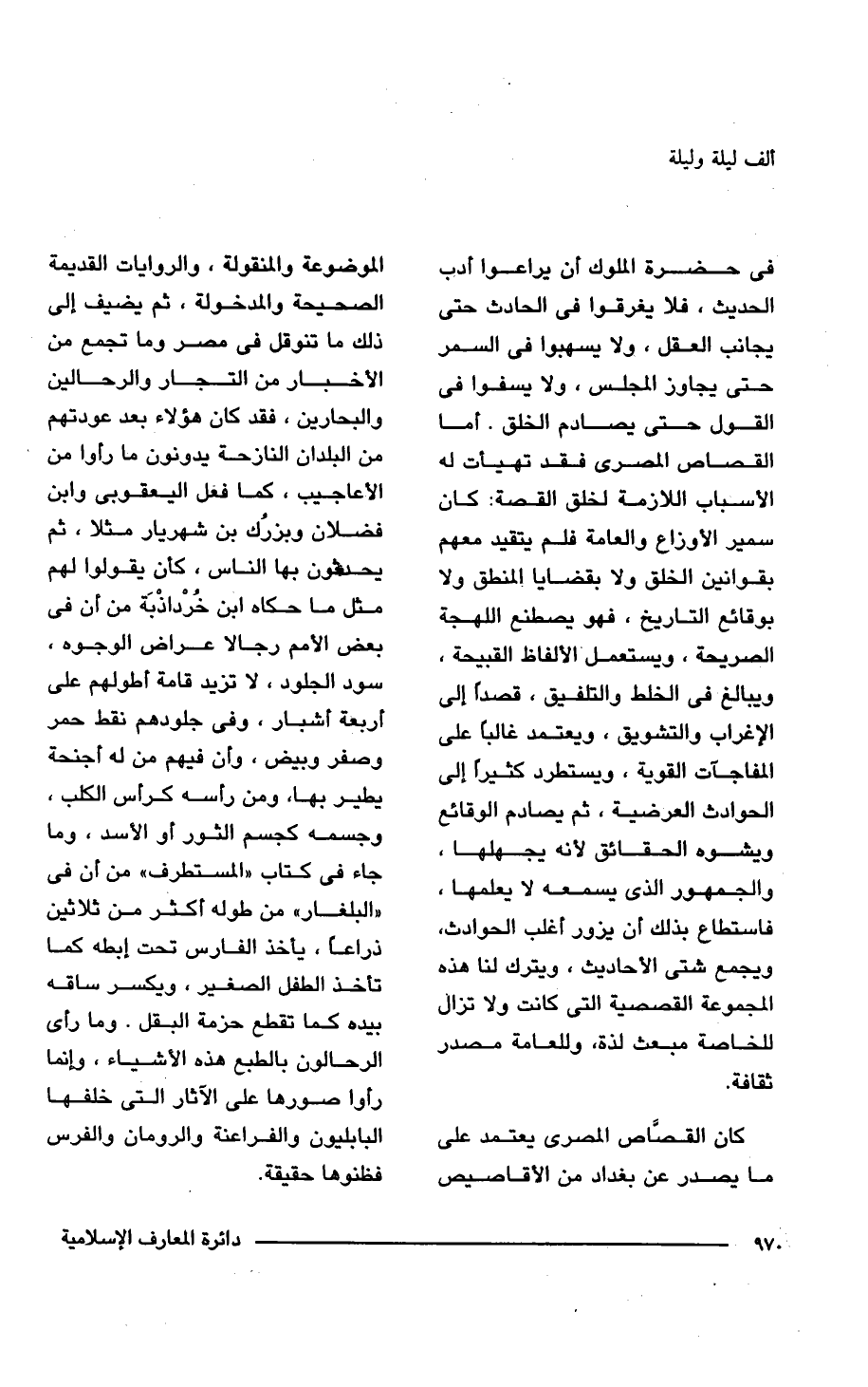 فى حضرة الملوك أن يراعوا أدب الحديث، فلا يغرقوا فى الحادث حتى يجانب العقل، ولا يسهبوا فى السمر حتى يجاوز المجلس، ولا يسفوا فى القول حتى يصادم الخلق. أما القصاص المصرى فقد تهيأت له الأسباب اللازمة لخلق القصة: كان سمير الأوزاع والعامة فلم يتقيد معهم بقوانين الخلق ولا بقضايا المنطق ولا بوقائع التاريخ، فهو يصطنع اللهجة الصريحة، ويستعمل الألفاظ القبيحة، ويبالغ فى الخلط والتلفيق، قصداً إلى الإغراب والتشويق، ويعتمد غالبا على المفاجآت القوية، ويستطرد كثيراً إلى الحوادث العرضية، ثم يصادم الوقائع ويشوه الحقائق لأنه يجهلها، والجمهور الذى يسمعه لا يعلمها، فاستطاع بذلك أن يزور أغلب الحوادث، ويجمع شتى الأحاديث، ويترك لنا هذه المجموعة القصصية التى كانت ولا تزال للخاصة مبعث لذة، وللعامة مصدر ثقافة.