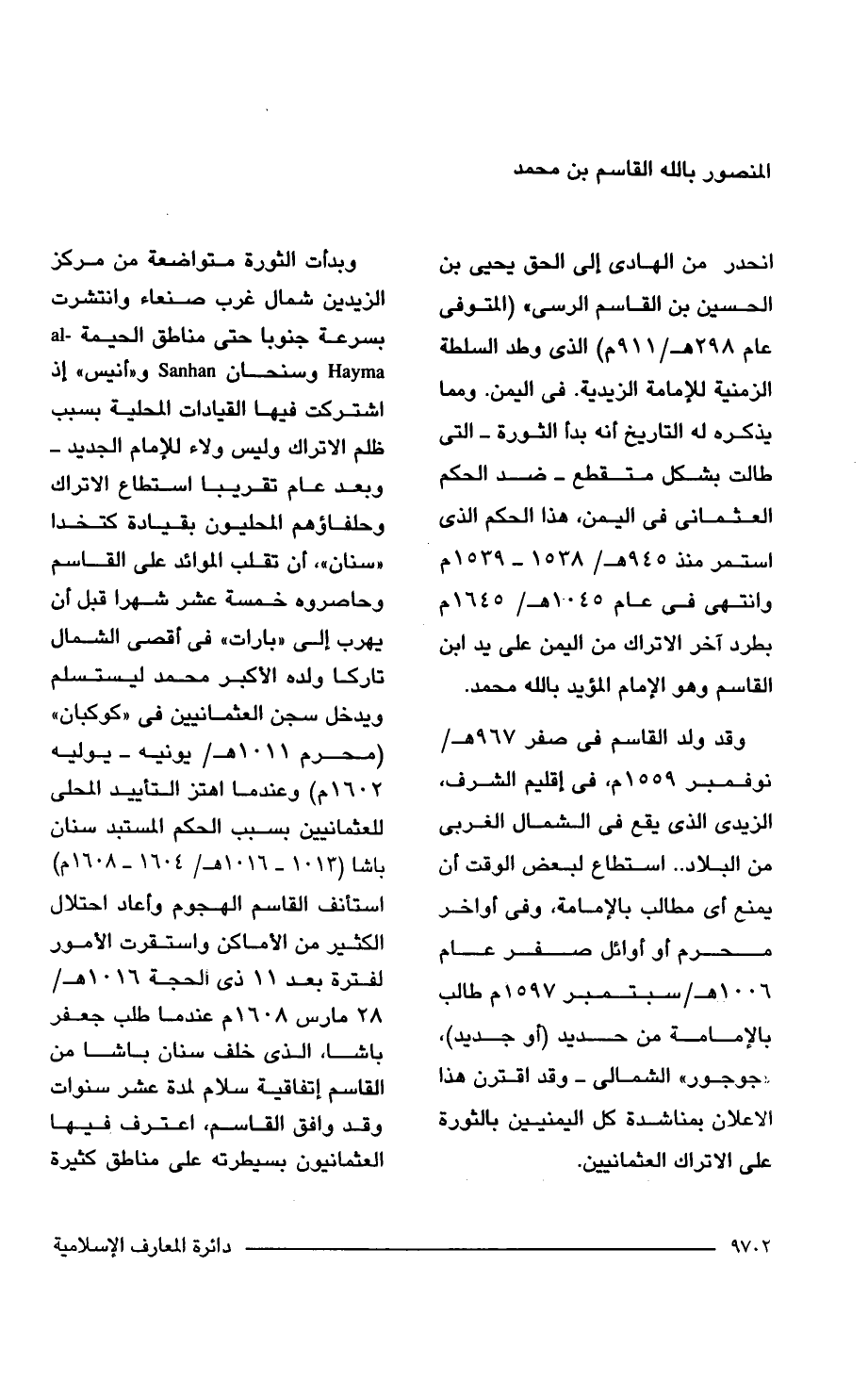انحدر من الهادى إلى الحق يحيى بن الحسين بن القاسم الرسى" (المتوفى عام 298 هـ/ 911 م) الذى وطد السلطة الزمنية للإمامة الزيدية فى اليمن. ومما يذكره له التاريخ أنه بدأ الثورة -التى طالت بشكل متقطع- ضد الحكم العثمانى فى اليمن، هذا الحكم الذى استمر منذ 945 هـ/ 1538 - 1539 م وانتهى فى عام 1045 هـ/ 1645 م بطرد آخر الاتراك من اليمن على يد ابن القاسم وهو الإمام المؤيد باللَّه محمد.