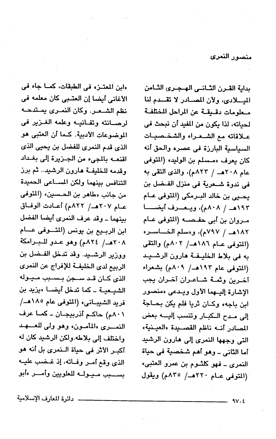 بداية القرن الثانى الهجرء الثامن الميلادى، ولأن المصادر لا تقدم لنا معلومات دقيقة عن المراحل المختلفة لحياته، لذا يكون من المفيد أن نبحث فى علاقاته مع الشعراء والشخصيات السياسية البارزة فى عصره والحق أنه كان يعرف "مسلم بن الوليد" (المتوفى عام 208 هـ/ 823 م)، والذى التقى به فى ندوة شعرية فى منزل الفضل بن يحيى بن خالد البرمكى (المتوفى عام 182 هـ/ 808 م)، ويعرف أيضا مروان بن أبى حفصه (المتوفى عام 182 هـ/ 797 م)، و"سلم الخاسر" (المتوفى عام 186 هـ/ 802 م) والتقى به فى بلاط الخليفة هارون الرشيد (المتوفى عام 193 هـ/ 809 م) بشعراء آخرين وثمة شاعران آخران يجب الإشارة إليهما الأول ويدعى "منصور ابن باجه" وكان ثريا فلم يكن بحاجة إلى مدح الكبار وتنسب إليه بعض المصادر أنه ناظم القصيدة "العينية" التى وجهها النمرى إلى هارون الرشيد أما الثانى -وهم أهم شخصية فى حياة النمرى- فهو كلثوم بن عمرو العتبى" (المتوفى عام 220 هـ/ 835 م) ويقول "ابن المعتز" فى الطبقات، كما جاء فى الأغانى أيضًا إن العتبى كان معلمه فى نظم الشعر. وكان النمرى يمتدحه لرصانته وتفانيه وعلمه الغزير فى الموضوعات الأدبية. كما أن العتبى هو الذى قدم النمرى للفضل بن يحيى الذى اقنعه بالمجئ من الجزيرة إلى بغداد وقدمه للخليفة هارون الرشيد. . ثم برز التنافس بينهما ولكن المساعى الحميدة من جانب "طاهر بن الحسين" (المتوفى عام 207 هـ/ 822 م) أعادت الوفاق بينهما -وقد عرف النمرى أيضا الفضل ابن الربيع بن يونس (المتوفى عام 208 هـ/ 824 م) وهو عدو للبرامكة ووزير الرشيد. وقد تدخل الفضل بن الربيع لدى الخليفة للإفراج عن النمرى الذى كان قد سجن بسبب ميوله الشيعية -كما تدخل أيضًا "يزيد بن فريد الشيبانى" (المتوفى عام 185 هـ/ 801 م) حاكم أذربيجان- كما عرف النمرى "المأمون" وهو ولى للعهد واختلف إلى بلاطه. ولكن الرشيد كان له أكبر الأثر فى حياة النمرى بل أنه هو الذى وقع أمر وفاته، إذ غضب عليه بسبب ميوله للعلويين وأمر "أبو