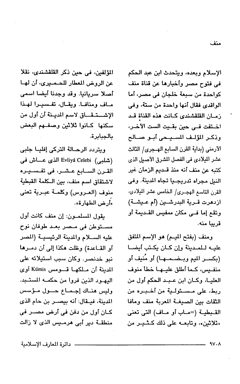 الإسلام وبعده، ويتحدث ابن عبد الحكم فى فتوح مصر وأخبارها عن قناة منف كواحدة من سبعة خلجان فى مصر، أما الواقدى فقال أنها واحدة من ستة، وفى زمان القلقشندى كانت هذه القناة قد اختفت فى حين بقيت الست الآخر، وذكر المؤلف المسيحى أبو صالح الأرمنى (بداية القرن السابع الهجرى/ الثالث عشر الميلادى فى الفصل المشرق الأصيل الذى كتبه عن منف أنه منذ قديم الزمان غير النيل مجراه تدريجيا تجاه المدينة. وفى القرن التاسع الهجرى/ الخامس عشر الميلادى، ازدهرت قرية البدرشين (أم عيشة) وتقع إما فى مكان ممفيس القديمة أو قريبا منه.
