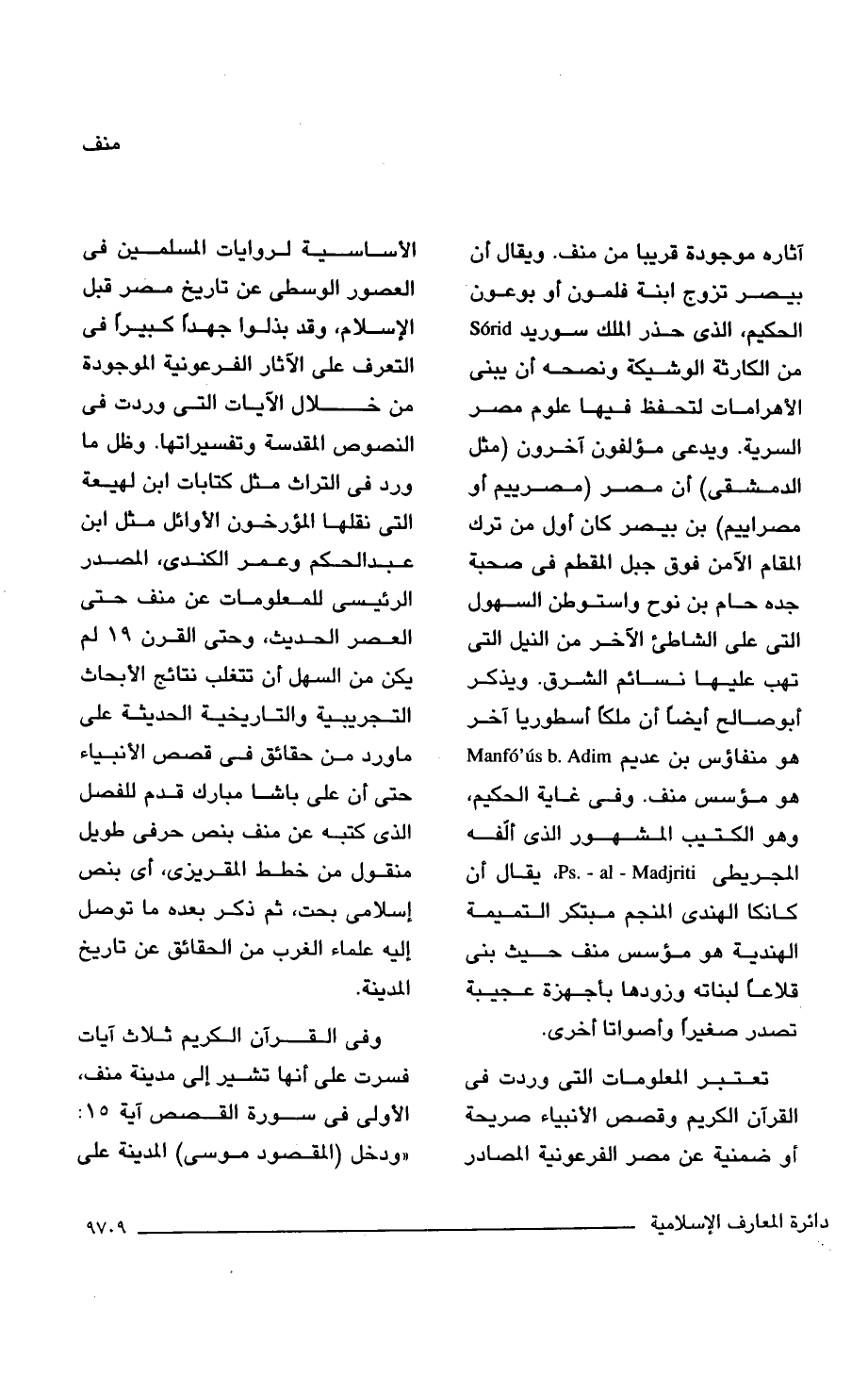 تعتبر المعلومات التى وردت فى القرآن الكريم وقصص الأنبياء صريحة أو ضمنية عن مصر الفرعونية المصادر الأساسية لروايات المسلمين فى العصور الوسطى عن تاريخ مصر قبل الإسلام، وقد بذلوا جهدًا كبيرًا فى التعرف على الآثار الفرعونية الموجودة من خلال الآيات التى وردت فى النصوص المقدسة وتفسيراتها. وظل ما ورد فى التراث مثل كتابات ابن لهيعة التى نقلها المؤرخون الأوائل مثل ابن عبد الحكم وعمر الكندى، المصدر الرئيسى للمعلومات عن منف حتى العصر الحديث، وحتى القرن 19 لم يكن من السهل أن تتغلب نتائج الأبحاث التجريبية والتاريخية الحديثة على ما ورد من حقائق فى قصص الأنبياء حتى أن على باشا مبارك قدم للفصل الذى كتبه عن منف بنص حرفى طويل منقول من خطط المقريزى، أى بنص إسلامى بحت، ثم ذكر بعده ما توصل إليه علماء الغرب من الحقائق عن تاريخ المدينة.